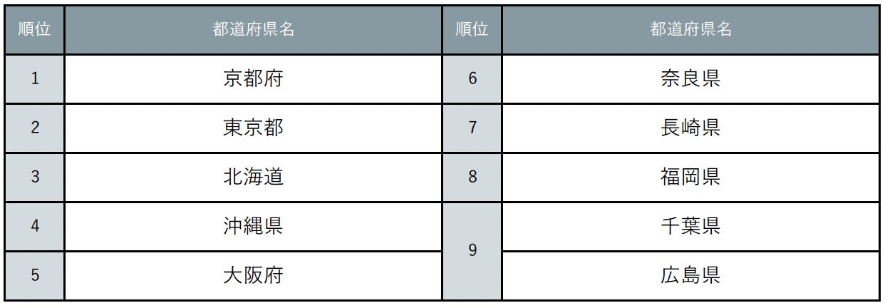 【1位:京都府】圧倒的な得票数を獲得した京都府。「修学旅行で訪れたことがきっかけで」「東京から京都は修学旅行の定番!楽しい思い出がある」「思い出深い場所」など、当時の思い出を重ねながら再度訪れたというエピソードが多数寄せられました。さらに「大人になってまた行きたい場所」というコメントも多く、歴史や文化、四季折々の景観まで、何度訪れても楽しいスポットがたくさんあることも京都府の魅力のようです。