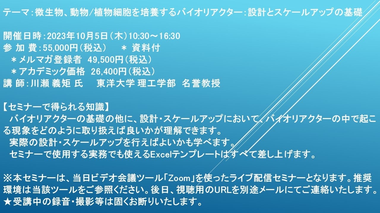 【ライブ配信セミナー】微生物、動物/植物細胞を培養するバイオリアクター:設計とスケールアップの基礎 10月5日(木)開催 主催:(株)シーエムシー・リサーチ