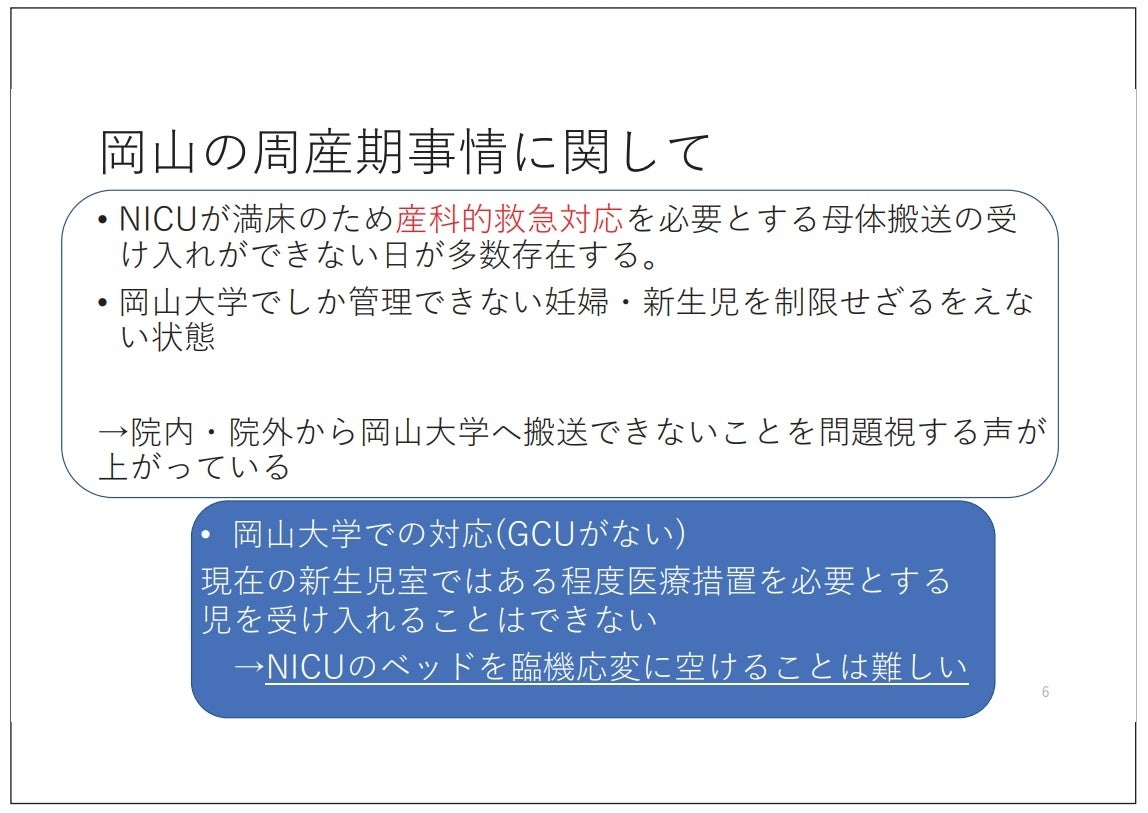 国立大学法人岡山大学(本部:岡山市北区、学長:那須保友)の岡山大学病院はこれまで、地域周産期母子医療センターとして、NICU 6床・新生児室 12床(GCUはなし)で診療してきましたが、NICUが満床になった場合、近隣病院への母体搬送や新生児の受け入れをお願いしていました。