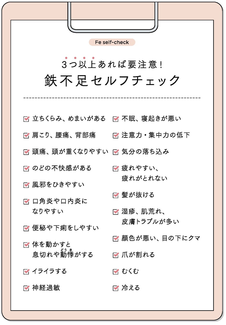 貧血やかくれ貧血で現れやすい症状が自分にないか、下のチェック表で確認してみましょう。