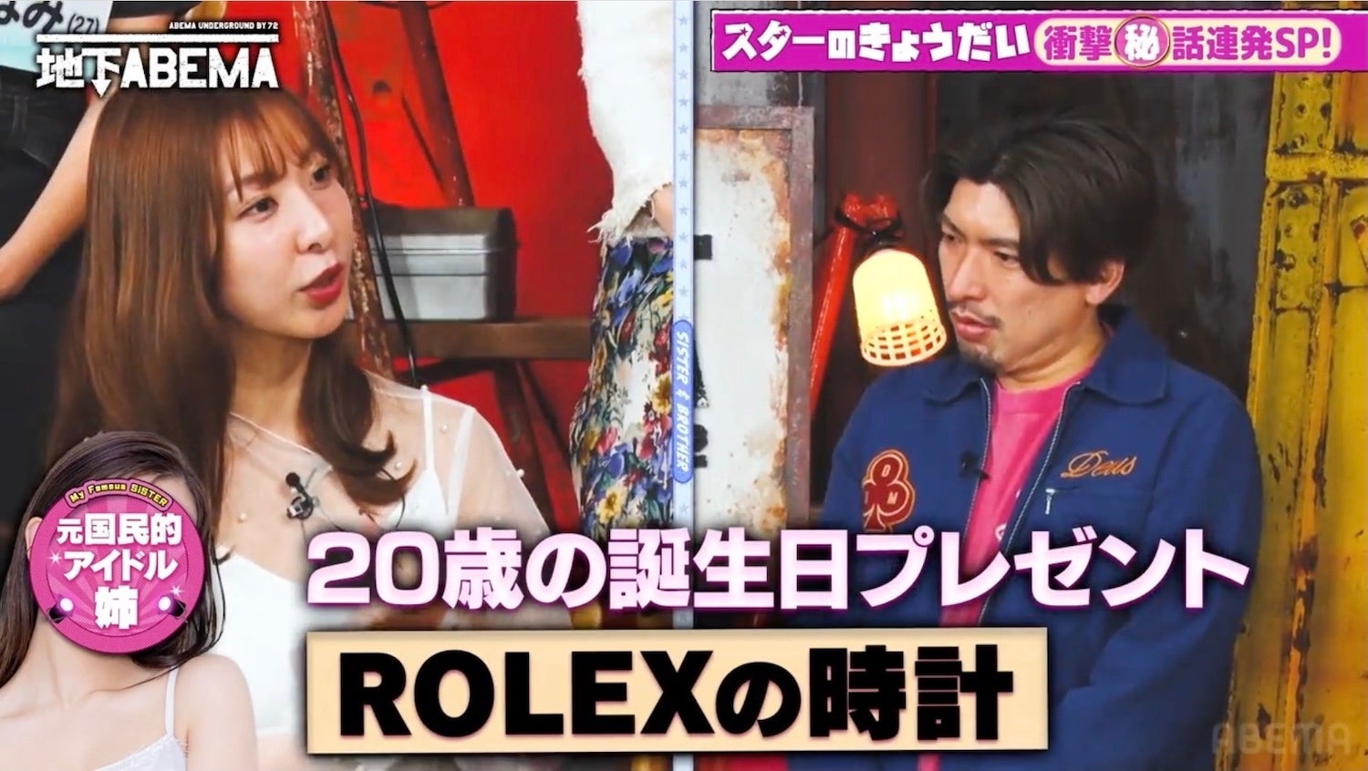 さらにスタジオでは、きょうだいからもらったプレゼントの話に。Travis Japan・松田元太の妹で、アイドルグループ『UN1CON』のメンバー・KOKOROは、「お兄ちゃんが、UN1CONのメンバー全員に『これから頑張れ』という応援の気持ちを込めてサングラスをくれた」「お小遣いもちょくちょくくれる」と暴露。板野成美は、20歳の誕生日に姉・友美よりロレックスの時計をもらったことをぶっちゃけ、あまりの高額プレゼントにスタジオは騒然に…。さらに、お笑いコンビエルフ・荒川の妹で3児の母・みなみは、「子どもたちにプレゼントを買ってあげて」とお金を渡してくれることや、相方のはるからもお祝いをもらっていることを明かしました。