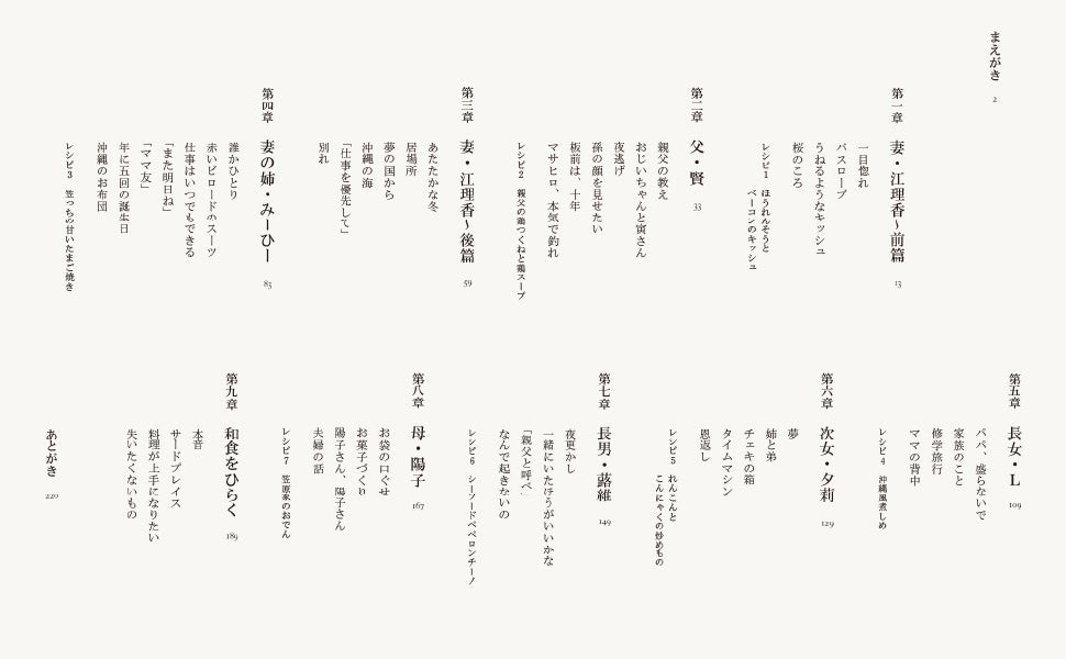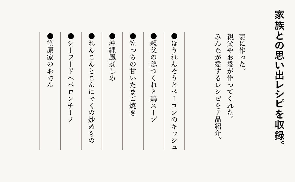 この本には、妻や家族に作ったレシピや、父や母が作ってくれたレシピなど、笠原家の思い出に欠かせないレシピが7品紹介されています。笠原さんと家族をつなぐ味は、心にまで染みわたるはずです。
