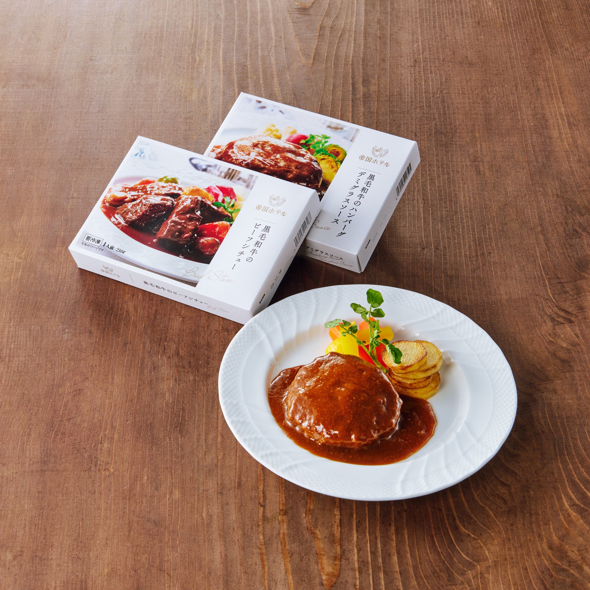 <帝国ホテル>黒毛和牛のハンバーグ デミグラスソース2,592 円(1 人前 /190g)湯せんで約18 分※画像は盛り付けの一例です。 黒毛和牛のビーフシチュー3,564 円(1 人前 /210g)湯せんで約15 分(右から)