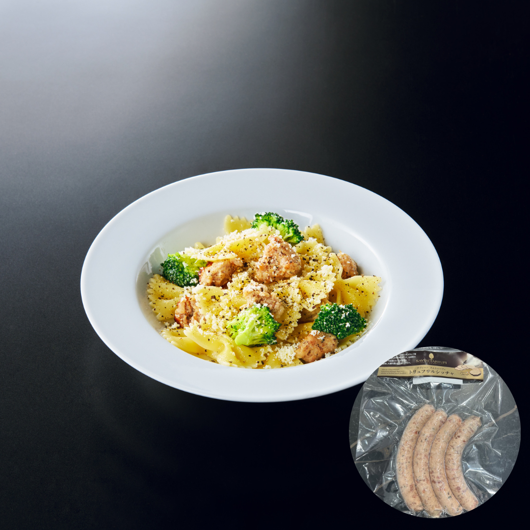 <サヴィーニ タルトゥーフィ>トリュフサルシッチャ 3,888 円(80g×4 本)※画像は調理の一例です。
