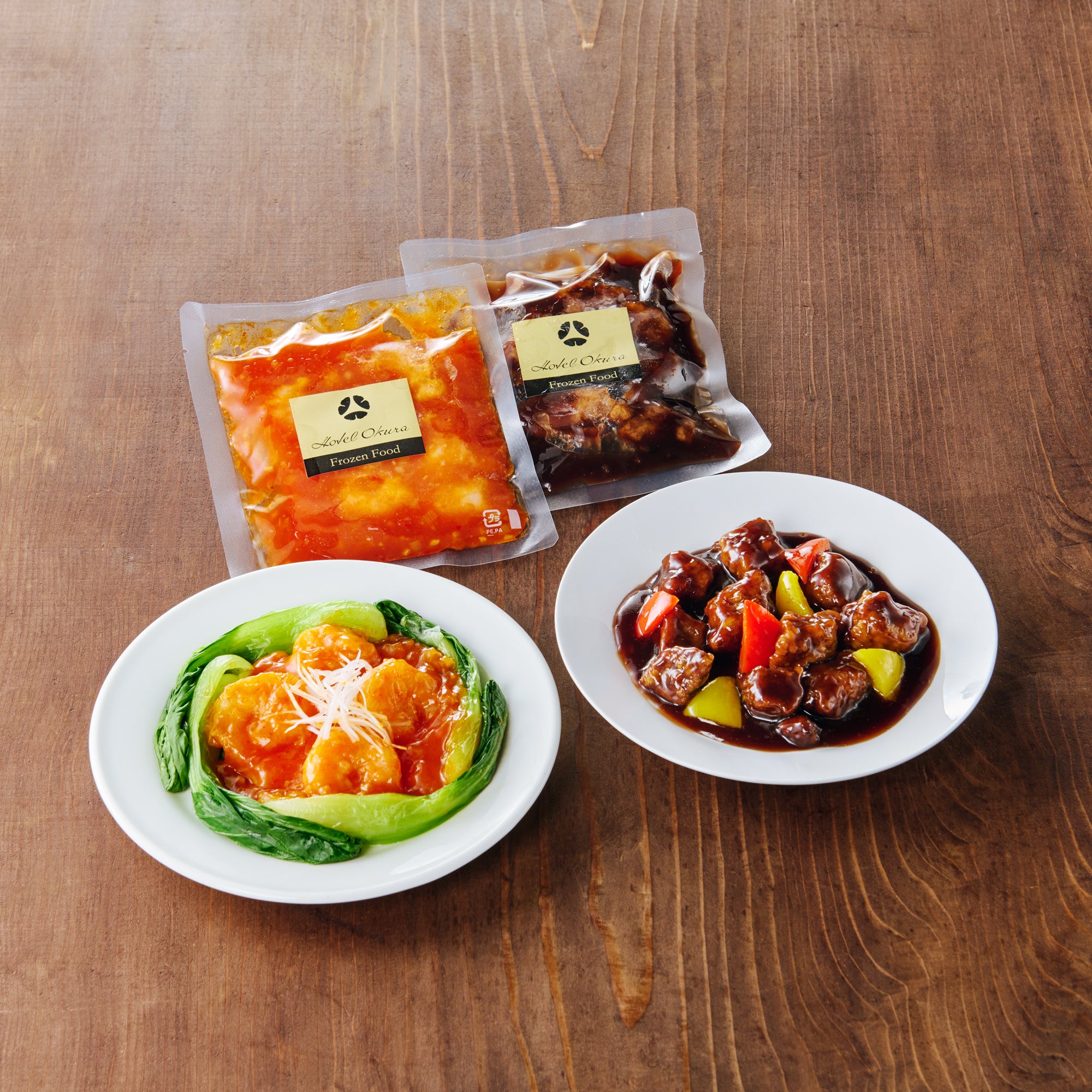 <ホテルオークラ 桃花林>エビのチリソース煮 1,404 円(1 人前 /140g)湯せんで約8 分※画像は盛り付けの一例です。 黒酢の酢豚1,512 円(1 人前 /180g)湯せんで約10 分※画像は盛り付けの一例です。(左から)