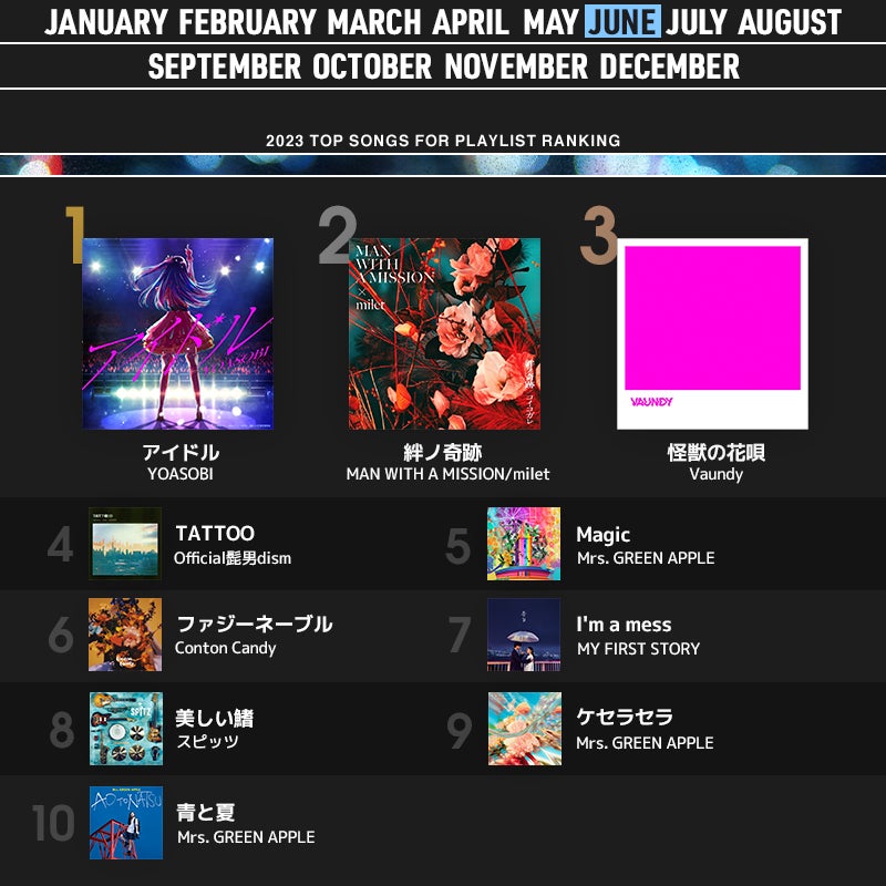 2023年6月度は、TVアニメ『推しの子』オープニングテーマに起用され、コールパートをREAL AKIBA BOYZが担当していることでも話題になっているYOASOBIの「アイドル」が3ヵ月連続で1位を獲得。2 位には、MAN WITH A MISSION がmiletとコラボした、TV アニメ『鬼滅の刃』刀鍛冶の里編オープニングデーマの「絆ノ奇跡」、3位はロングヒットを続けているVaundyの「怪獣の花唄」が輝いています。その他にも、TikTokを中心にバイラルヒット中のConton Candy「ファジーネーブル」が6位に、『コカ・コーラCoke STUDIO』キャンペーンソングに起用された「Magic」をはじめ、Mrs. GREEN APPLEの楽曲が3曲TOP10にランクインしています。ぜひ、この続きはランキング50位までを発表しているプレイリストでお楽しみください。