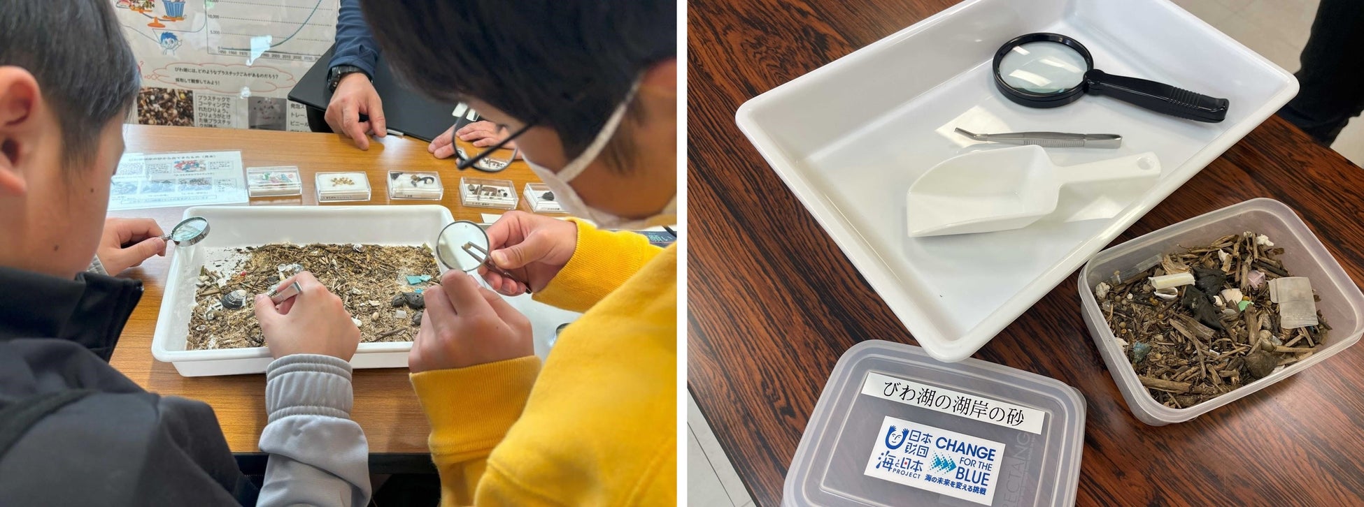 寄贈する観察キットには、琵琶湖岸で収集した砂やトレイ、ピンセット、ルーペなどが含まれています。琵琶湖岸の砂に何が含まれているかを知るために、ピンセットを使って選り分け、ルーペで観察します。小石や砂、植物の種など自然物に交じって、砕けて細かくなった発泡スチロールやビニールの袋の破片、田んぼから流れ出た被覆肥料のプラスチック殻など、様々なものが混ざっていることを学ぶことができます。