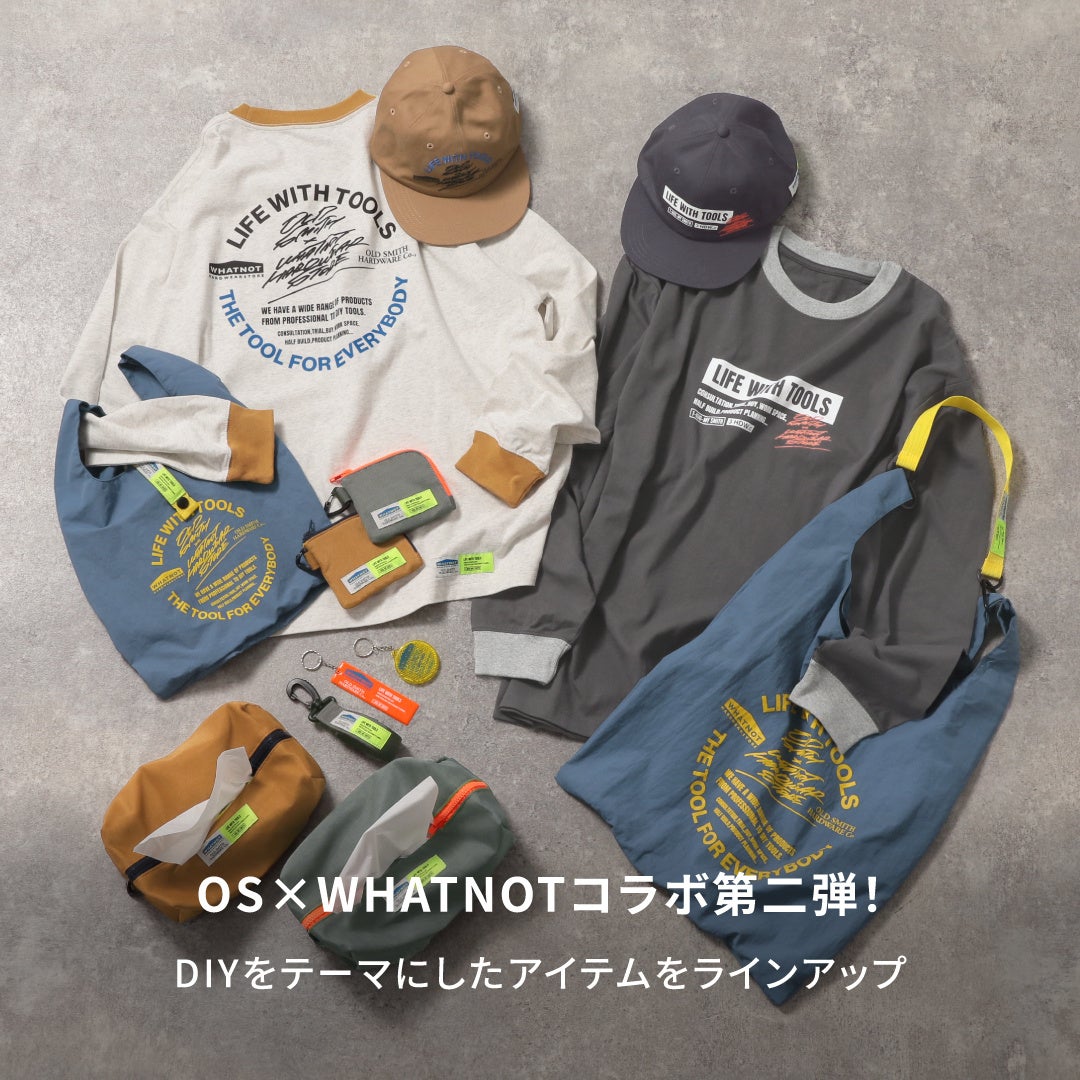 第二弾のコラボレーションアイテムは、アパレルと服飾雑貨が加わり、リブの配色がアクセントになっているロングTシャツとキャップはユニセックスで楽しめるデザインです。新登場するDIYをイメージしたコード結束テープは、下部がマジックテープの仕様になっています。また、今回のアイテムには「WHATNOT HARDWEAR STORE」で使用しているロゴを落とし込んだデザインに仕上げているのもポイントです。