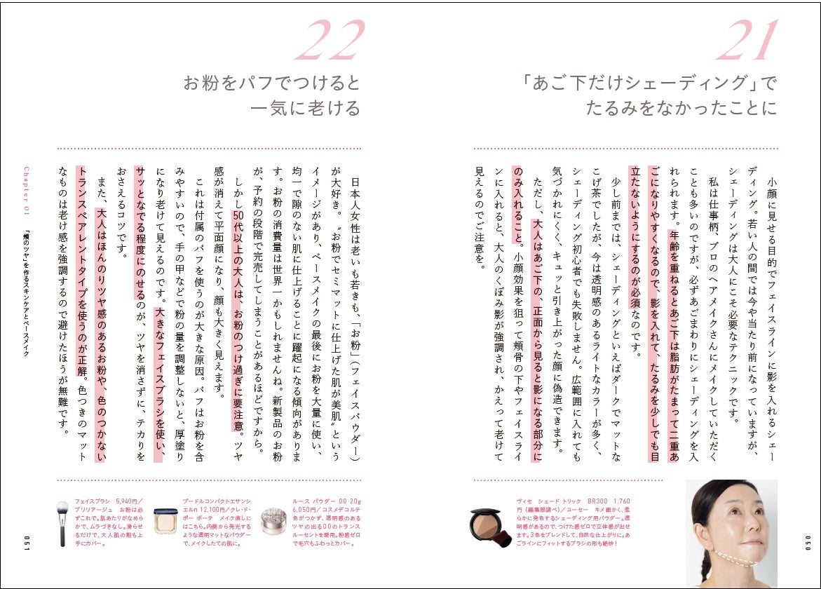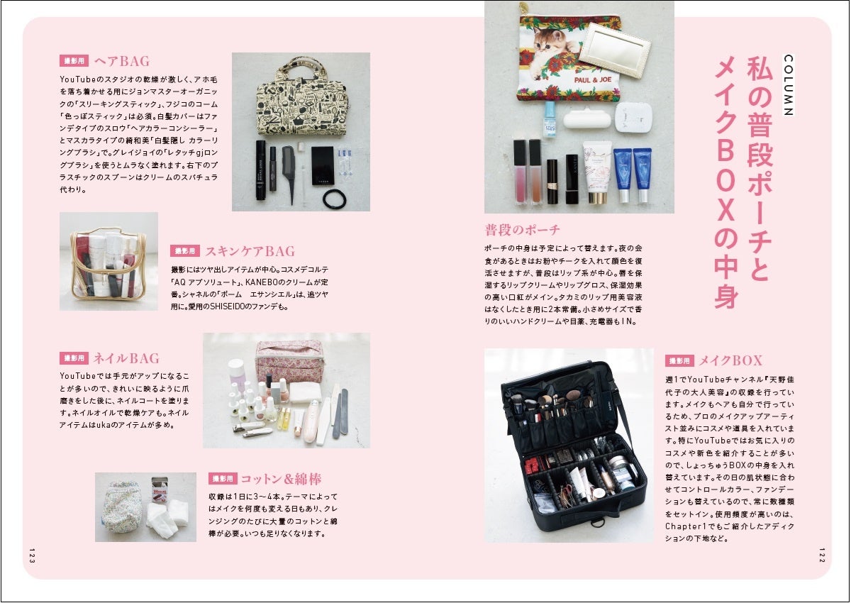 本書では、編集者として40年間美容業界にかかわり、自身もコスメマニアである天野さんが選び抜いた化粧品や健康グッズも紹介。リアルな肌色を映す鏡、夕方のくすみを一掃するラベンダーのパウダー、しぼんだ唇をふっくら若く偽造する粘膜カラーのリップペンシルなど、大人の女性の悩みを解消するアイテムばかり。YouTubeの収録で使うメイクボックスや普段使いのポーチの中身見せも。