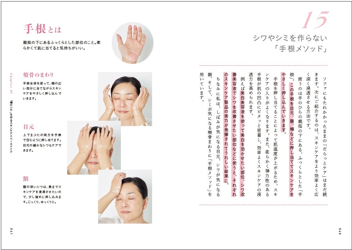 驚くほどたるみやシワの目立たない天野さん。その秘密は「手根を使ったマッサージです。スキンケアアイテムを下から上へなじませたあと、手根で目元や額、頬骨をじっくりプッシュ。顔の筋肉や皮膚に正しい位置を思い出させるのです」。