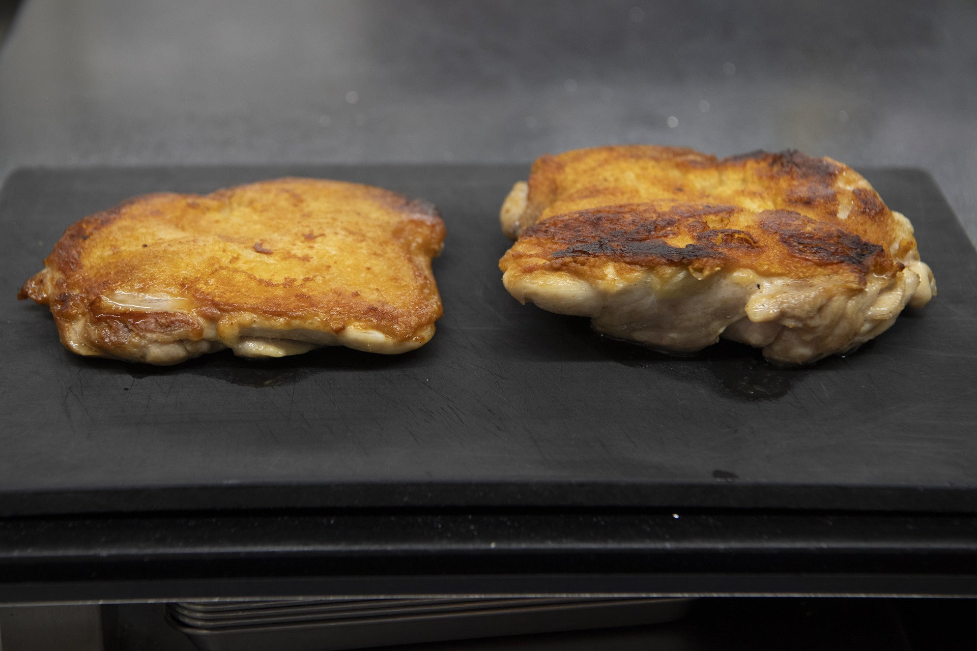 肉汁を閉じ込めつつ皮の収縮も抑える効果があるため、ジューシーかる皮目がパリッとした理想のチキンステーキが楽しめます。