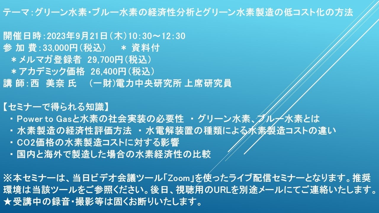 【緊急開催!ライブ配信セミナー】グリーン水素・ブルー水素の経済性分析とグリーン水素製造の低コスト化の方法 9月21日(木)開催 主催:(株)シーエムシー・リサーチ