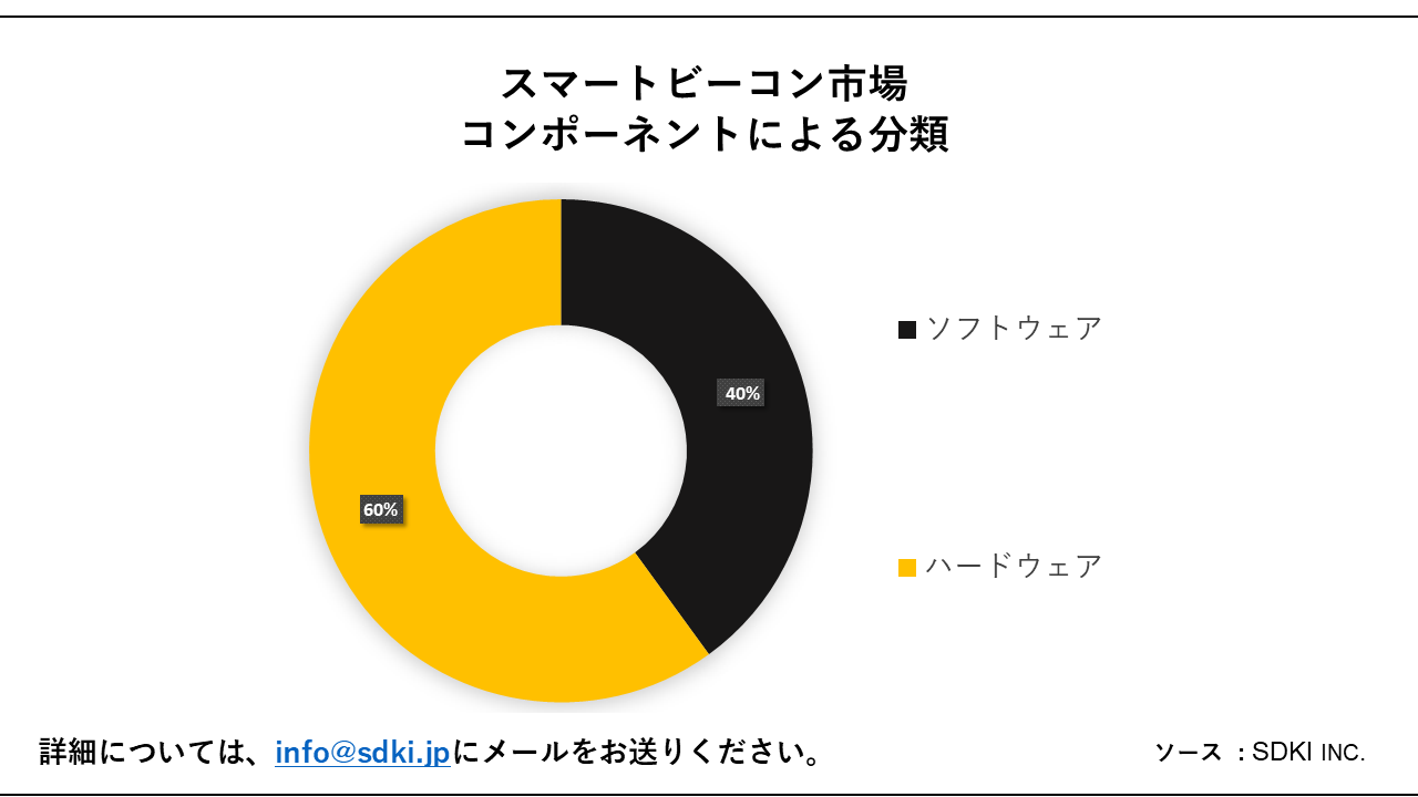 コンポーネントに基づいて、2035年末には、ハードウェアセグメントが最大の市場シェアを占めると予想されています。ビーコンのハードウェアは、どんな場所にも簡単に設置することができ、複雑さも最小限に抑えられます。ビーコンの需要は、ロケーションベースのアプリケーションやサービスに高い関心があるため、小売、輸送、物流など、複数の業界から高まっているようです。報告書によると、2019年のスマートビーコン市場では、ビーコンハードウェア分野が最も高いシェアを占め、市場全体の70%以上を占めました。