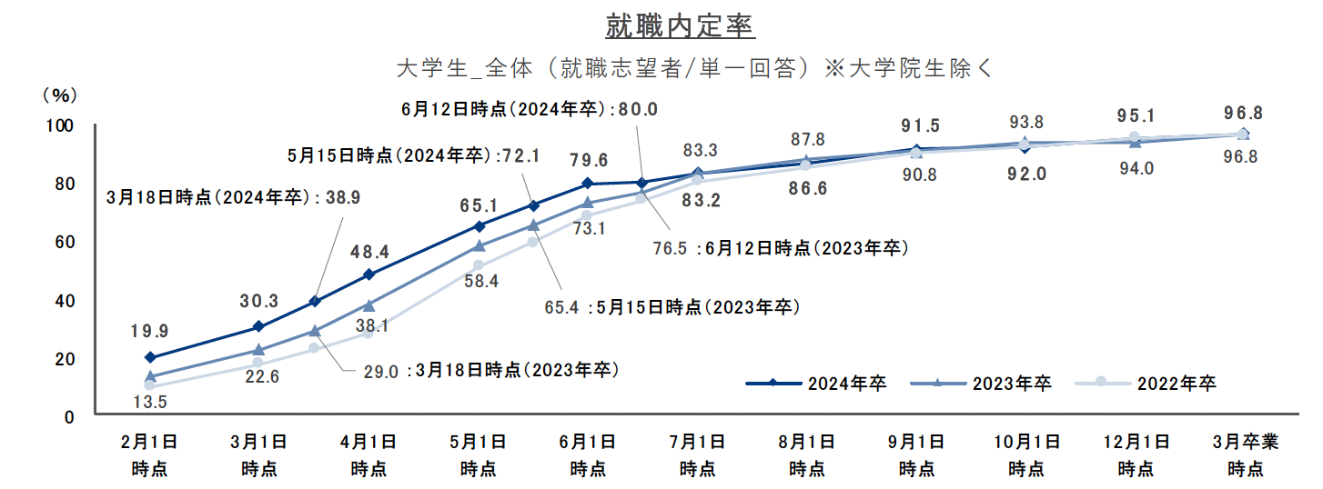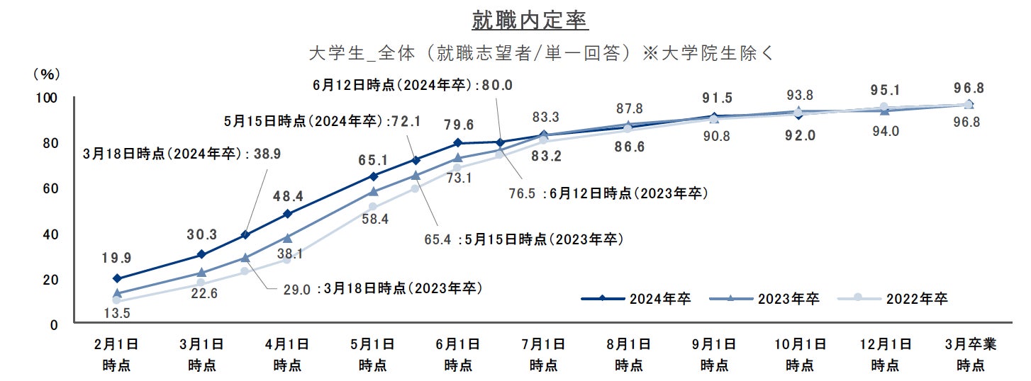 3月卒業時点の就職内定率は96.8%で、前年同水準。就職確定先から内定を取得した時期のピークは4月。5~6月がピークだった前年に比べ早まる