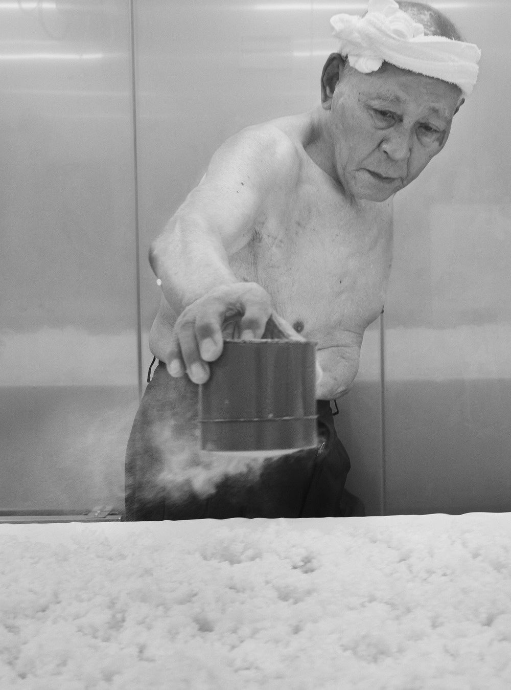 酒蔵内の麹室で、蒸し米に種麹を振りかける農口さん。若い世代の蔵人とともに早朝から現場で働き、酒造りの技を伝承している。