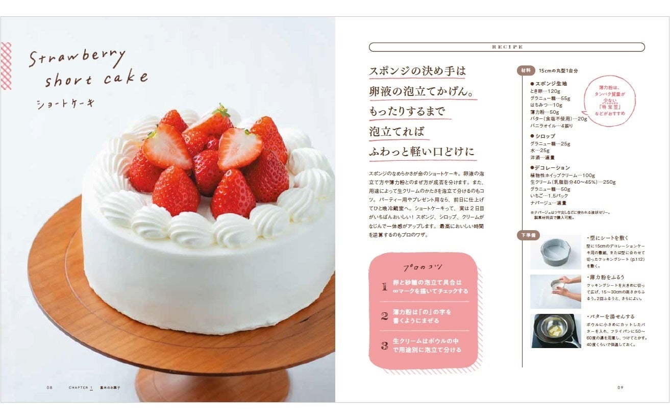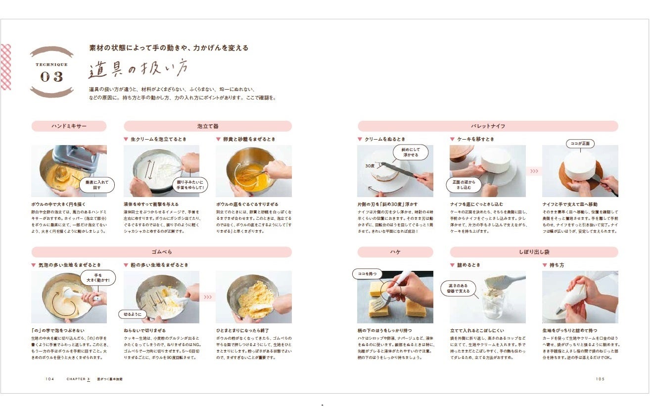 「お菓子をおいしく美しく仕上げるために、プロの動作には1つ1つ意味があります。意味を知って意識するだけで、仕上がりが変わります」。材料の計量の仕方や粉のふるい方、泡立て器やしぼり出し袋の扱い方などの基本テクニックのコツも解説。
