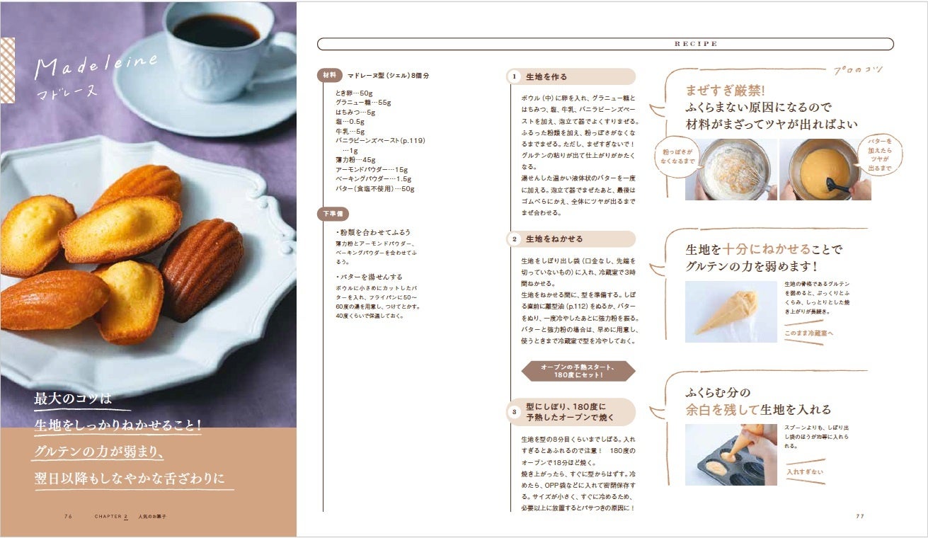 ディアマンなど、アイスボックスタイプのクッキーをきれいな円形に切るためには、「生地はラップをしいたタオルの上で切ってください。つぶれず美しい正円に」。スコーンをしっかりふくらませるには「焼き色をつけるための卵液を側面につけないこと。つけるとふくらみが悪くなります」など、小さいけれど仕上がりを左右するコツも満載。シフォンケーキは「メレンゲの泡をつぶさないのが最大のコツ。プロは泡をキープする『クリームタータ』を加えることもあります」というプロならではの裏技も。
