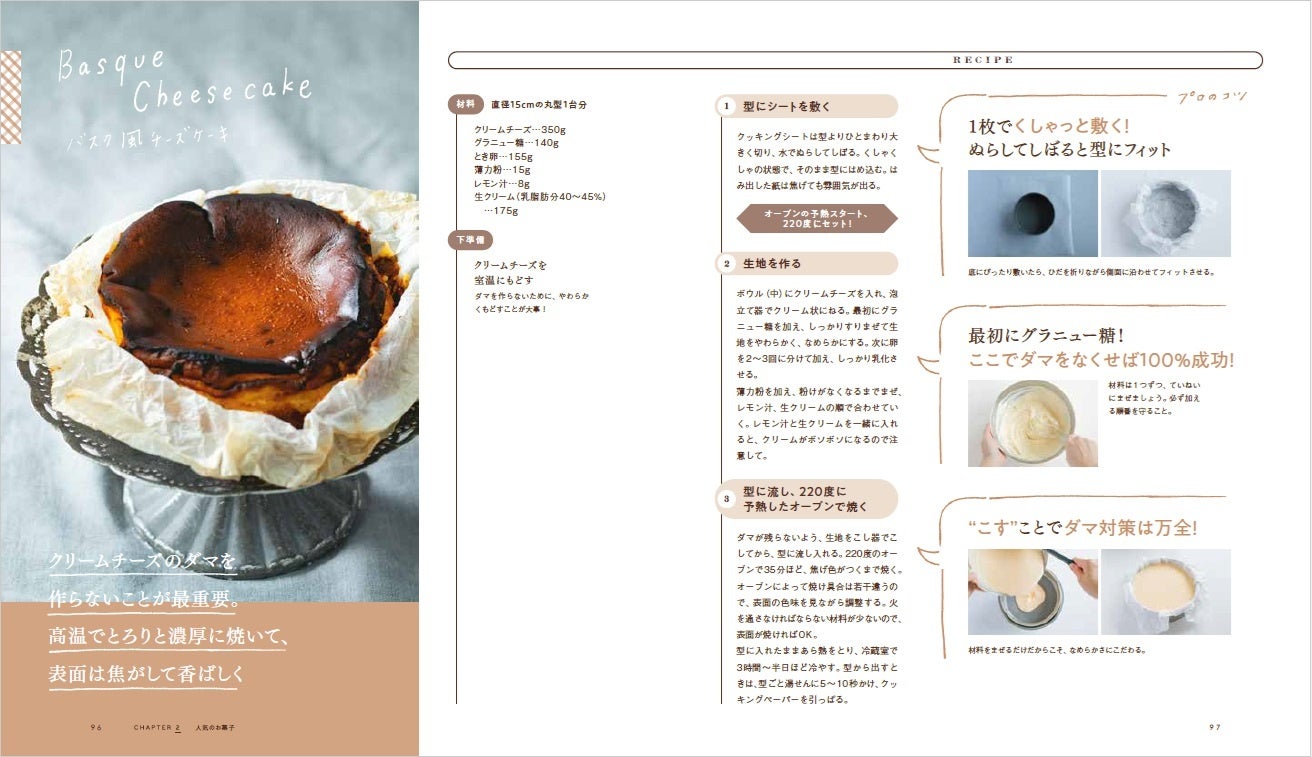 シフォンケーキ、フィナンシェ、スコーン、クッキー、バスクチーズケーキなど、人気の37種のお菓子づくりのコツを、家庭で作りやすいレシピとともに紹介。