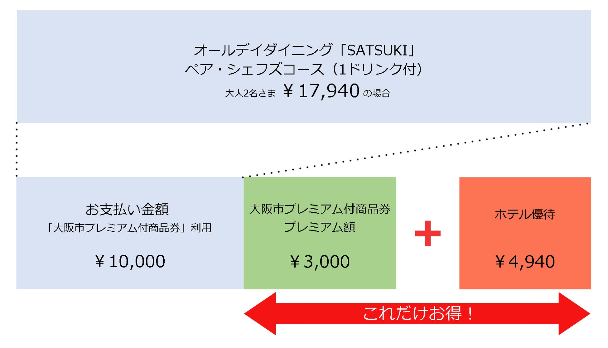〈通常料金〉大人2名 ¥17,940 ⇒¥13,000(「大阪市プレミアム付商品券」1枚利用)