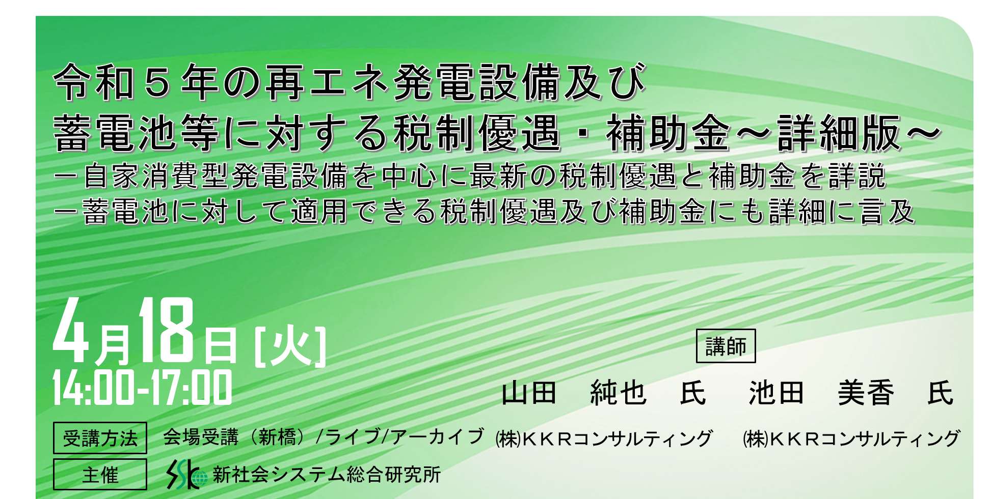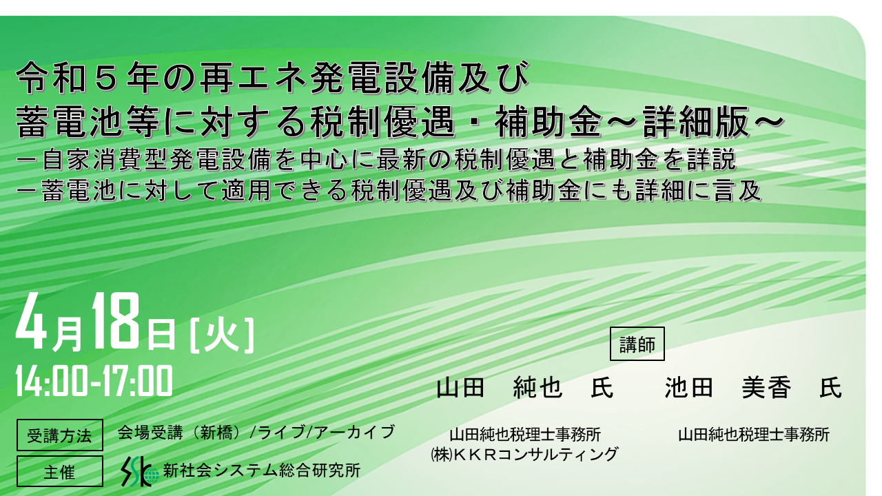 「令和5年再エネと蓄電池の税制補助金~詳細版~」と題して、山田純也税理士事務所 山田 純也氏/池田 美香氏によるセミナーを2023年4月18日(火)に開催!!