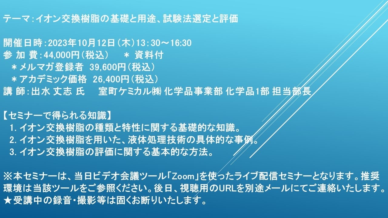 【ライブ配信セミナー】イオン交換樹脂の基礎と用途、試験法選定と評価 10月12日(木)開催 主催:(株)シーエムシー・リサーチ