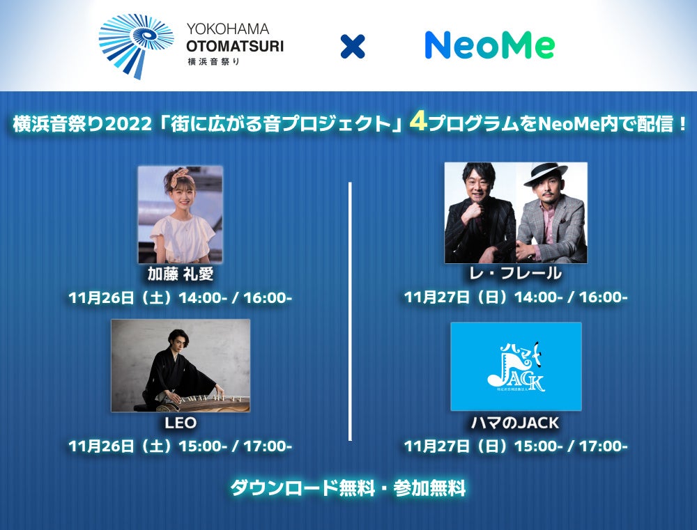 ぴあ株式会社(本社:東京都渋谷区、代表取締役社長:矢内廣)が運営するバーチャルライブアプリ「NeoMe」では、9月17日(土)~11月13日(日)に横浜市内各所にて行われた、横浜音祭り2022「街に広がる音プロジェクト」の内4プログラムについて、当日の模様を11/26(土)、11/27(日)の2間にかけて配信いたします。