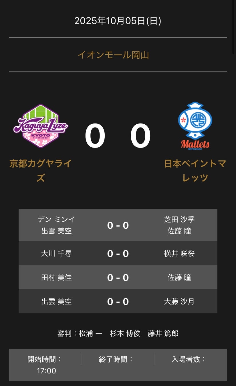 ノジマTリーグ 2025-2026 公式戦 10月5日開催 京都カグヤライズ vs 日本ペイントマレッツ 対戦オーダー発表