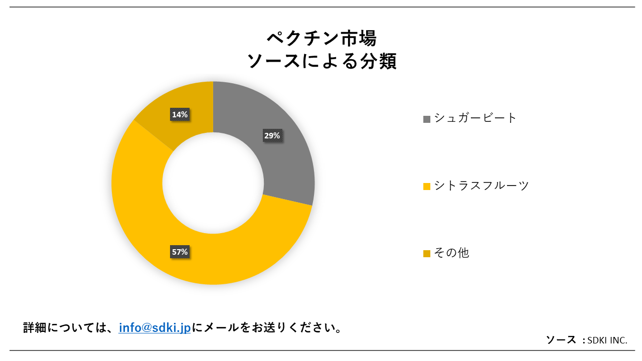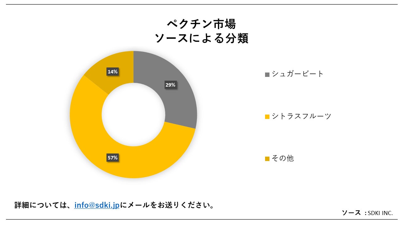 ソースに基づいて、2035年末までに最大の市場シェアを占めると予想されるのが、シトラスフルーツセグメントで す。オレンジ、レモン、グレープフルーツなどの柑橘類はペクチンを豊富に含んでおり、商業的なペクチン生産に広く利用されています。シトラスペクチンは、ゲル化剤、増粘剤、安定剤として、食品・飲料業界で広く使用されています。天然成分です。ジャム、ゼリー、フルーツフィリング、焼き菓子の製造に広く使用されています。今日、人々は、ほとんどが天然素材やオーガニック製品を含む食品を好んでいます。国際食品情報評議会(IFIC)によると、2021年6月時点で、米国の消費者の64%が天然物から作られた食品を好み、成人の63%が、少なくとも健康に中程度の効果をもたらす食品・飲料成分を好むようになるということであります。