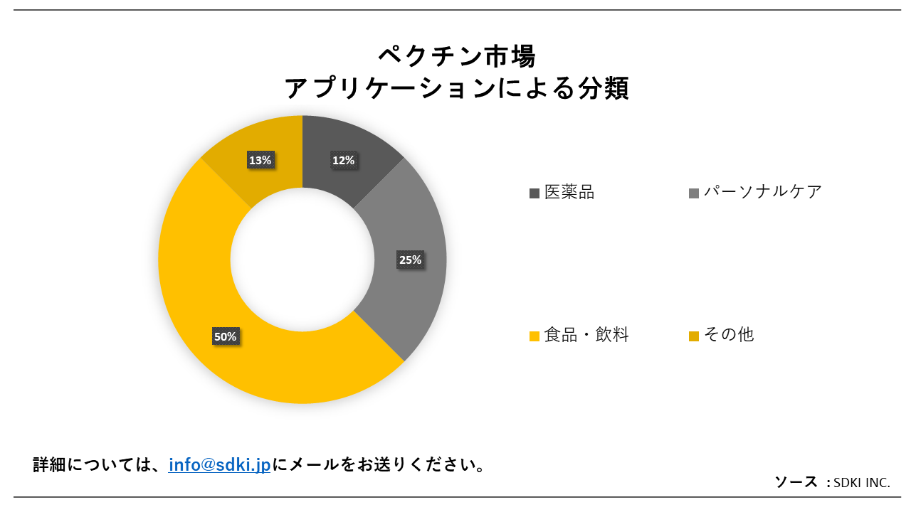 アプリケーションに基づいて、ペクチンは、ゲル化剤、増粘剤、食品安定剤として食品産業で使用されているため、食品・飲料セグメントが最も高いシェアを占めています。また、ジャムやマーマレードのシネレシス低減や、低カロリージャムのゲル強度向上にも役立っています。ペクチンはジャムの0.8~1%を占めます。