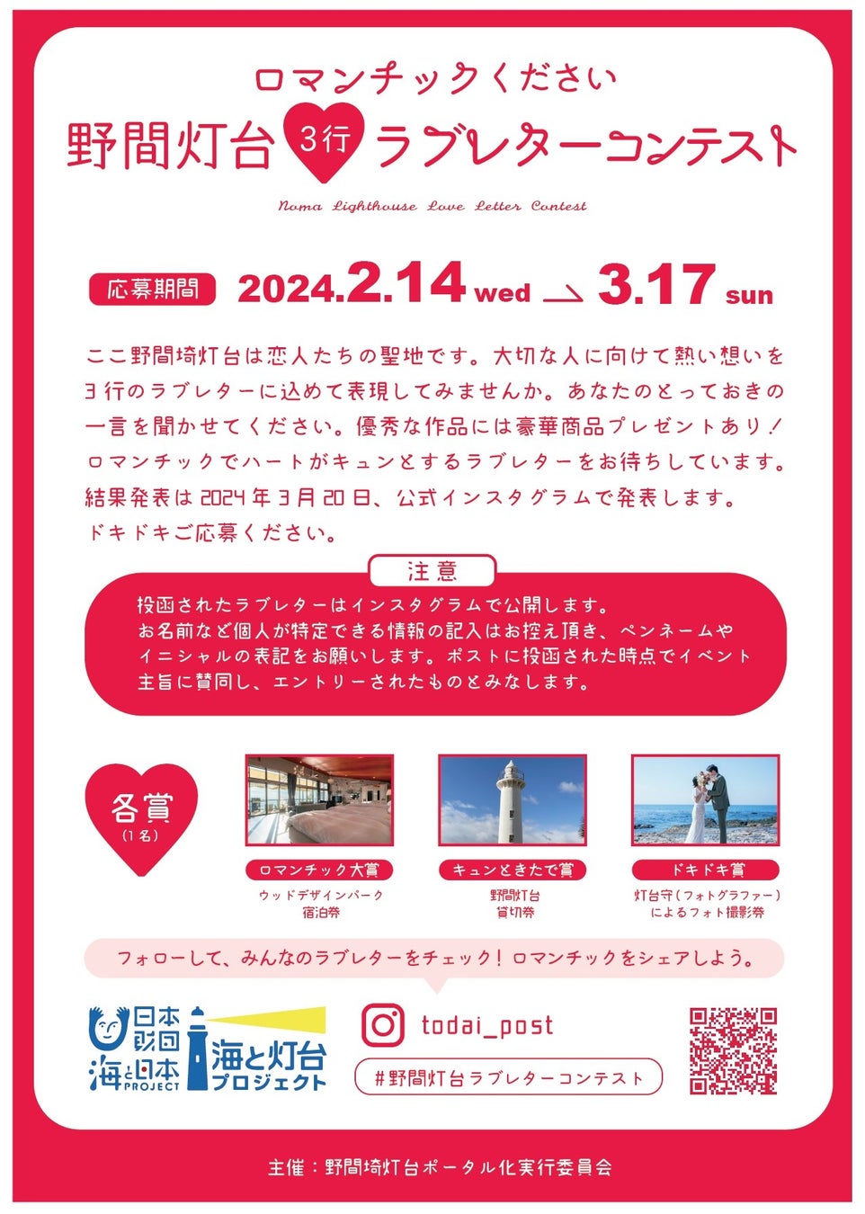 2024年2月14日(水)〜3月17日(日)、「ロマンチックください!野間灯台3行ラブレターコンテスト」を実施しています。1月20日に野間埼灯台前広場に“想いを照らす灯台ポスト”(以下:灯台ポスト)が設置されて以来初めて開催するもので、現地で応募カードに記載してポストに投函する方法とオンラインでも応募ができます。応募作品の中から3つのラブレターを選出し、景品が送られます。恋人たちの聖地としても親しまれる野間灯台で様々な愛を感じられることを期待します。
