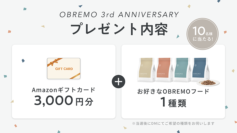販売開始3周年を記念して「3周年記念キャンペーン」を開催します。キャンペーンにご参加いただいた方の中から、抽選で10名様に「Amazonギフトカード3,000円分」「お好きなOBREMOフード 1種類」を「W」でプレゼントいたします!