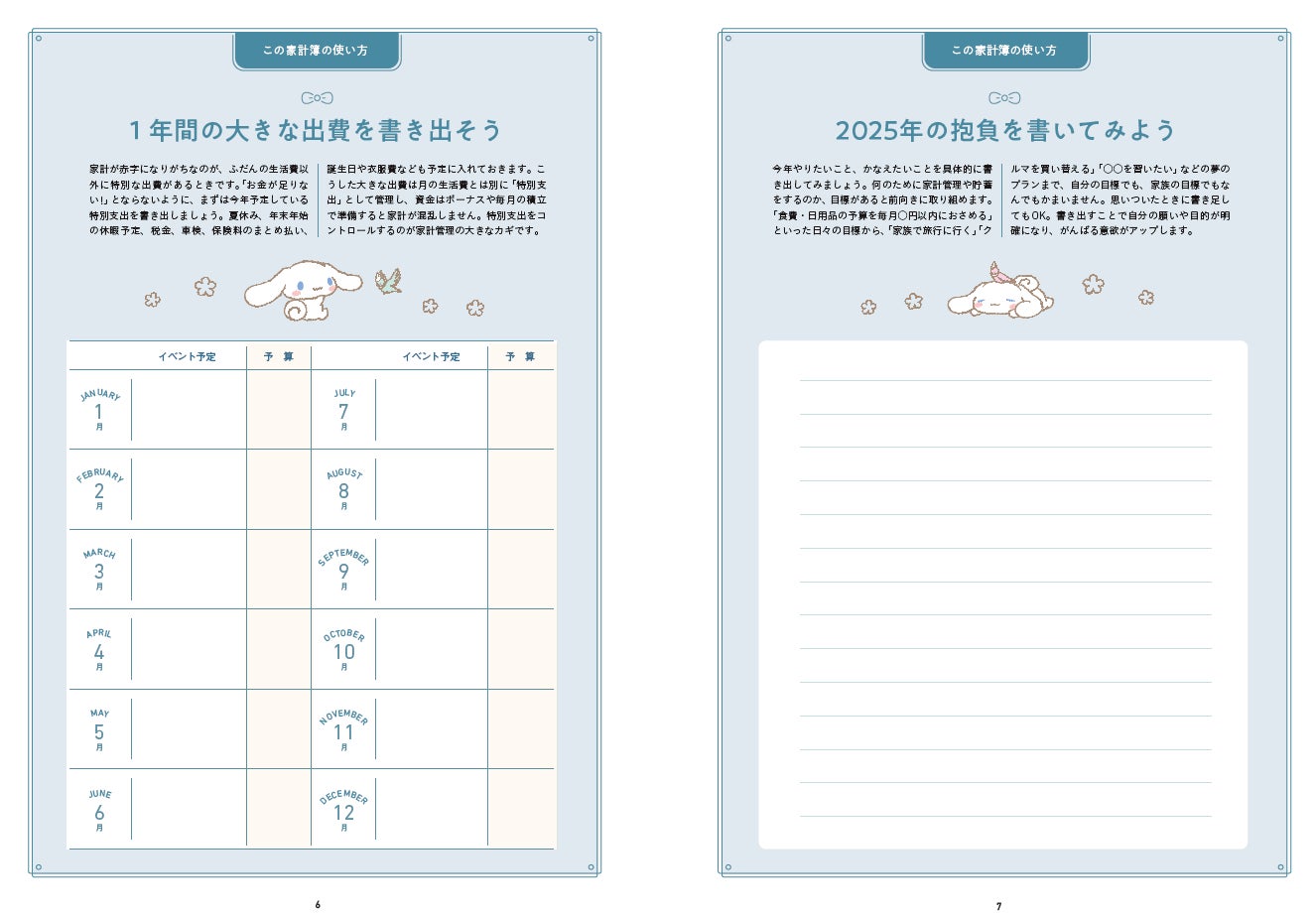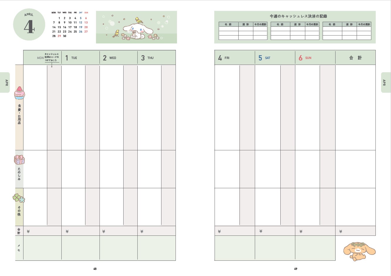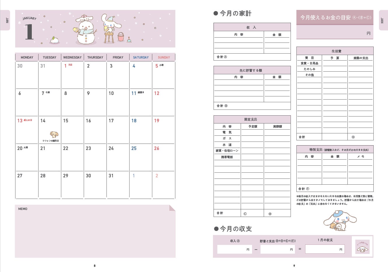 毎月、毎週、いろんな表情のかわいいシナモンたちが登場するので、ページをめくるのが楽しみに。綴じ込み付録として、キャラクターシールが98枚つくのも嬉しいポイント。さらに、巻頭・巻末ページも充実。1年間の大きな出費「特別支出」をまとめるページや、医療費のメモ、年間収支のまとめなど、役立つページで家計管理をサポートします。
