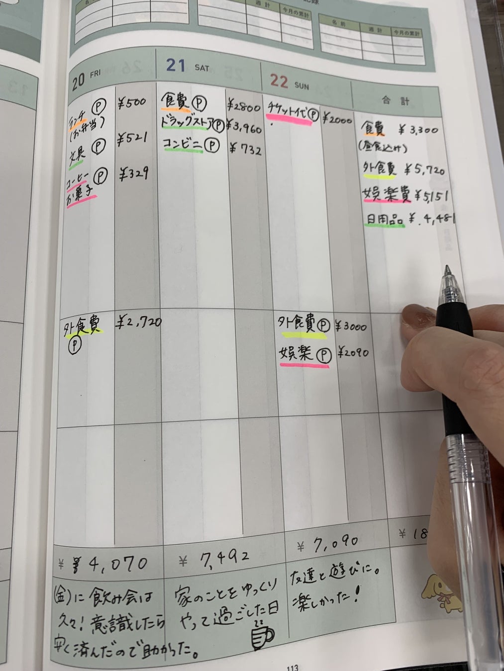 これまで、家計簿をつけることがなかなか習慣にならなかったのですが、日記だけは長年続けることができました。そのため、日記を書くスペースがあるのが個人的には推しポイント。その日のことを振り返るついでに記入ができるので、毎日続けられています。使ったお金を書き込む際は、マーカーで色分けをして、費目をより分かりやすく分類できるようにしました。自由度が高いので、自分でカスタマイズできるのがいいですね。