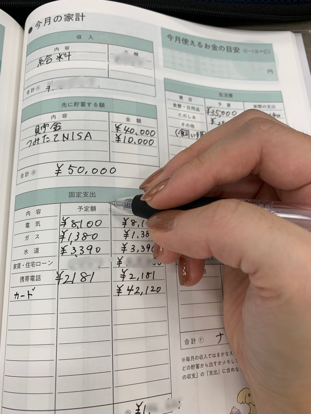収入の次に、「貯蓄する額」を記入する欄があるのは地味に嬉しいポイントです。先に貯金する額を確保できるのは自分としても身が引き締まります。「今月使えるお金の目安」が見える化できるのも良いですね! 使いすぎ防止に役立ちそうです。