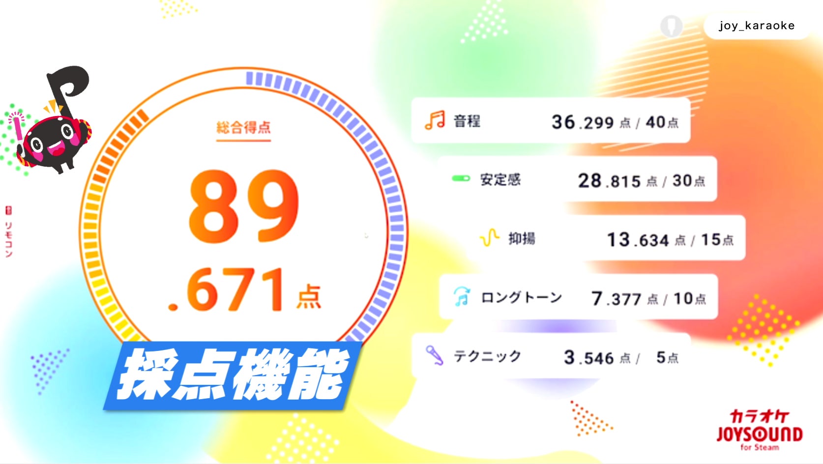 搭載機能:JOYSOUNDのカラオケ採点相当の採点機能、楽曲検索、キー変更、グリーンバック背景など