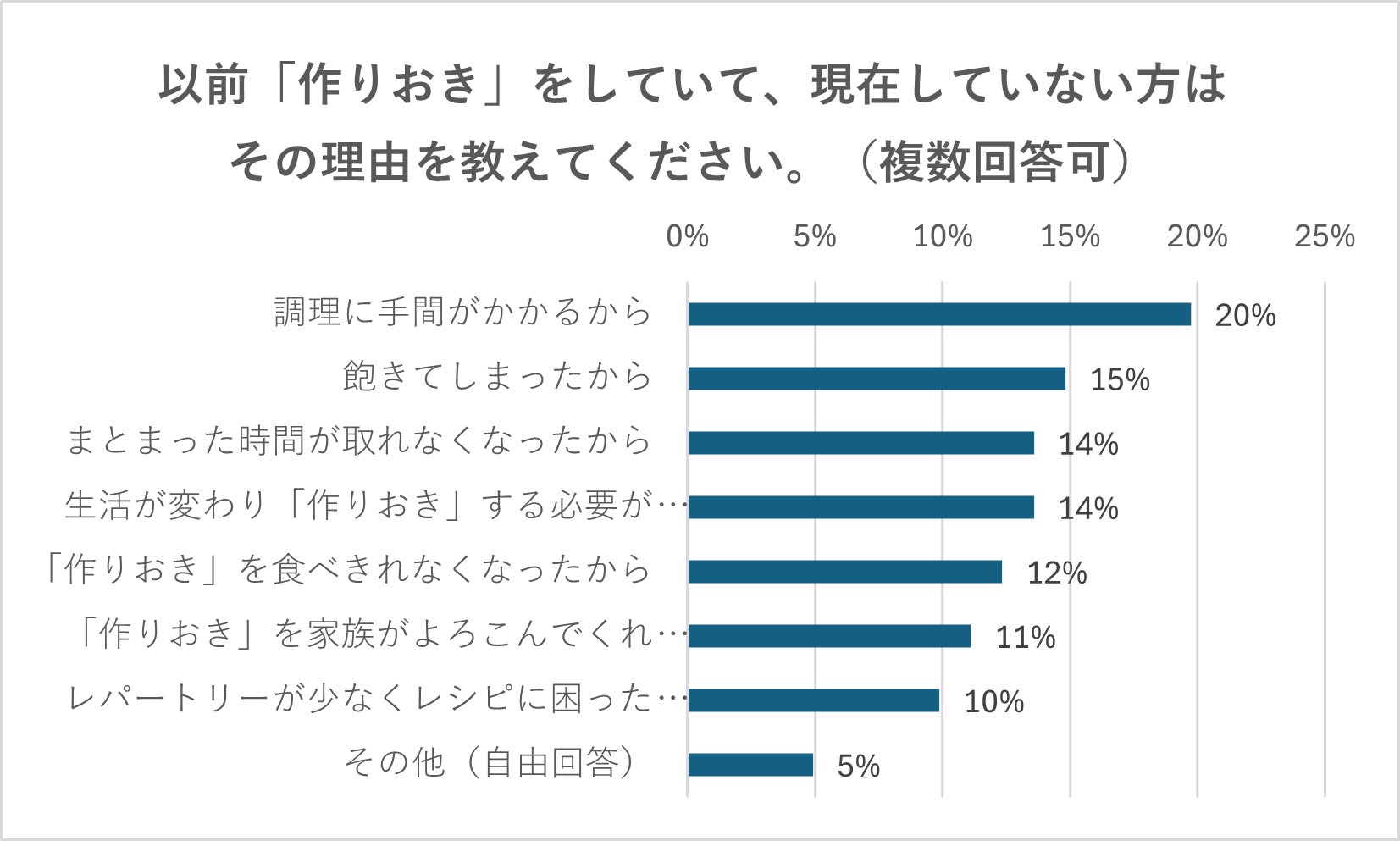 生活がコロナ禍以前の状態にもどったいま、慌ただしい日々を乗り切るためには、作りおきを味方につけるのが得策。けれど、約3割もの人が以前はしていた作りおきをやめていて、その理由として、手間がかかる20%、飽きてしまった15%、家族がよろこばない11%などがあがっています。