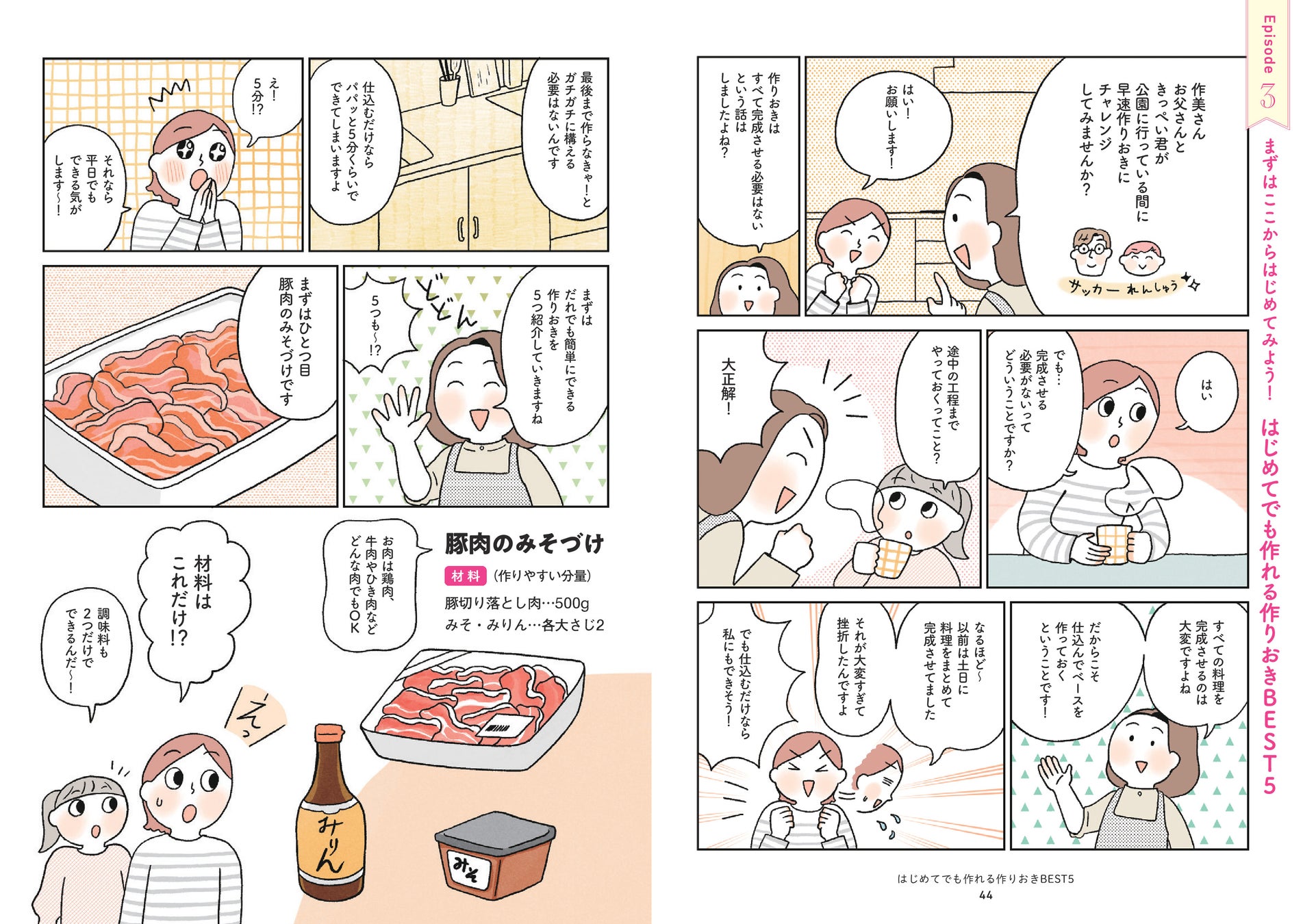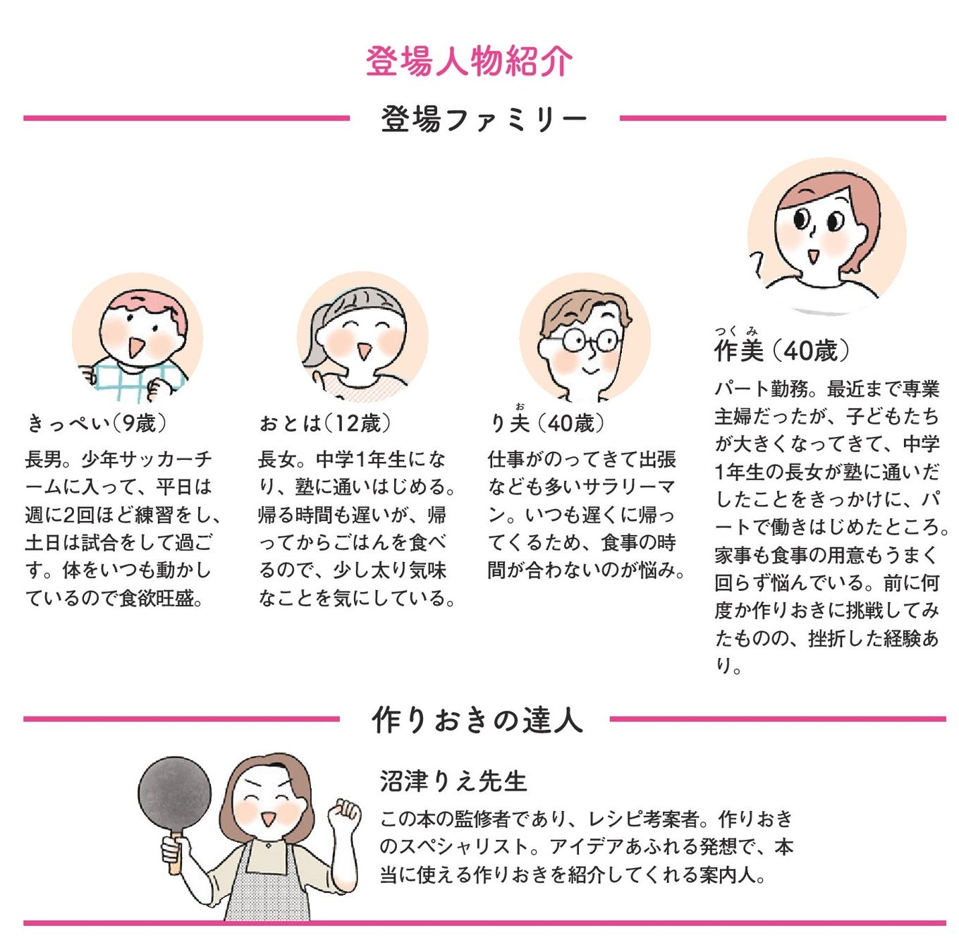 マンガは食品の保存方法にも造詣の深い料理研究家で料理教室を長年主宰する沼津りえさんが、「作りおき」に再挑戦するファミリーをサポートするストーリー。沼津さんが仕事と家庭(お子さん2人)を両立させるために実践してきた、とっておきの作りおきレシピを惜しみなく披露。主人公である作美(つくみ)さんに極意をやさしく指南していきます。本書を読み終えると、作りおきをラクに続けるためのノウハウが丸わかり!