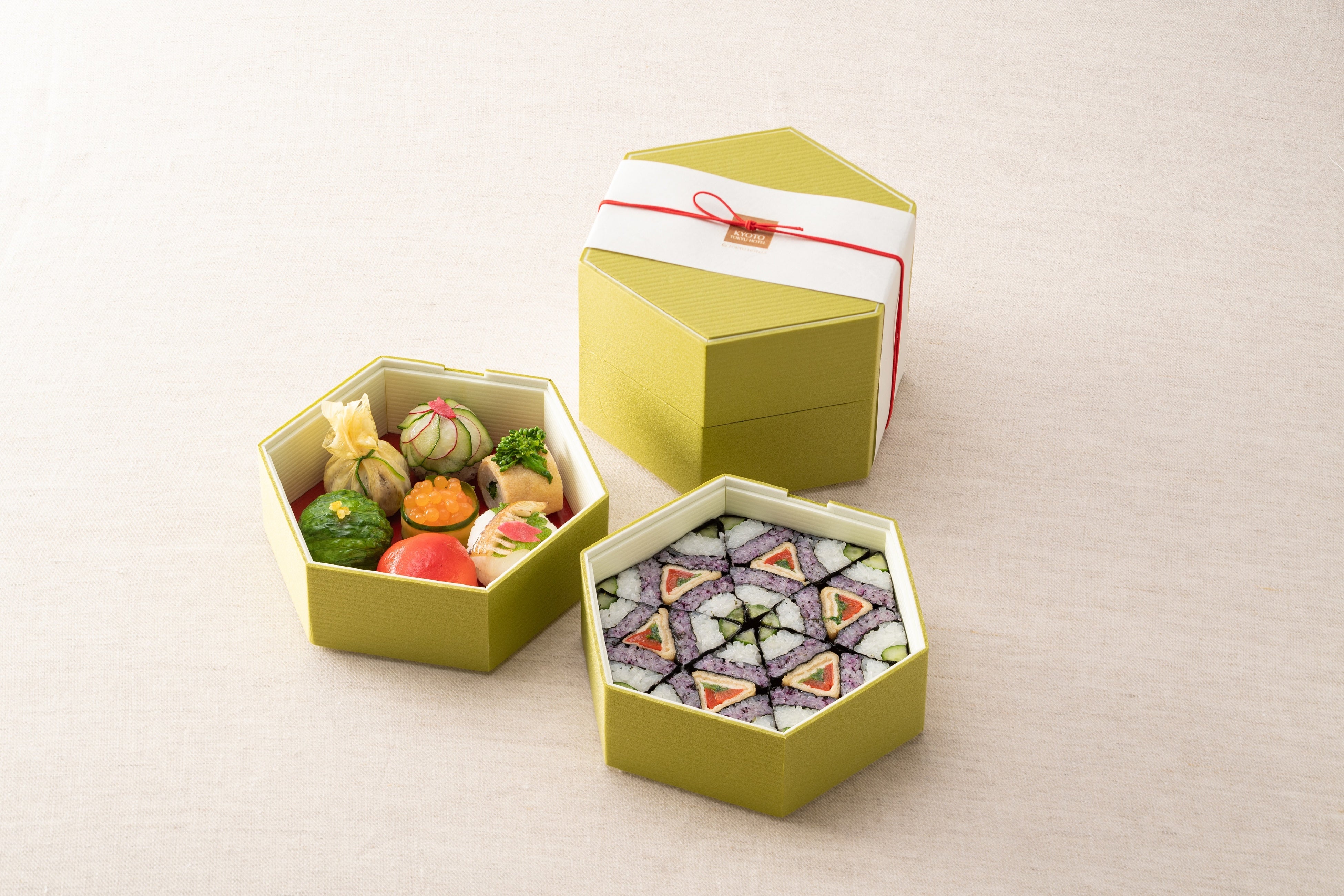 「‟きょうのええもん”おあがりやす」は、若手料理人の育成とグループチェーンの技術力向上を目的として毎年開催している「東急ホテルズ料理コンテスト」に、京都東急ホテルメインキッチンスタッフの河井大輝が出品し、準グランプリを受賞したものです。今年のコンテストのテーマは「プラントベース(※1)の美味しい料理〜テイクアウト仕様にて〜」。京の食文化の出汁を基本に、素材の持ち味や色合いを生かしたおばんざいの手法とベジブロス(※2)を融合させたお寿司で表現しました。上段にはイクラに見立てたピューレした人参を載せた軍艦寿司を中心に、京都の食材を使用した7種類の手毬寿司を彩り豊かに仕上げ、下段には万華鏡をイメージした飾り巻き寿司を詰めました。京都の食材をお楽しみいただけるように、京都産こしひかり、京揚げ、西京味噌、壬生菜、琴引の塩等を使用しています。