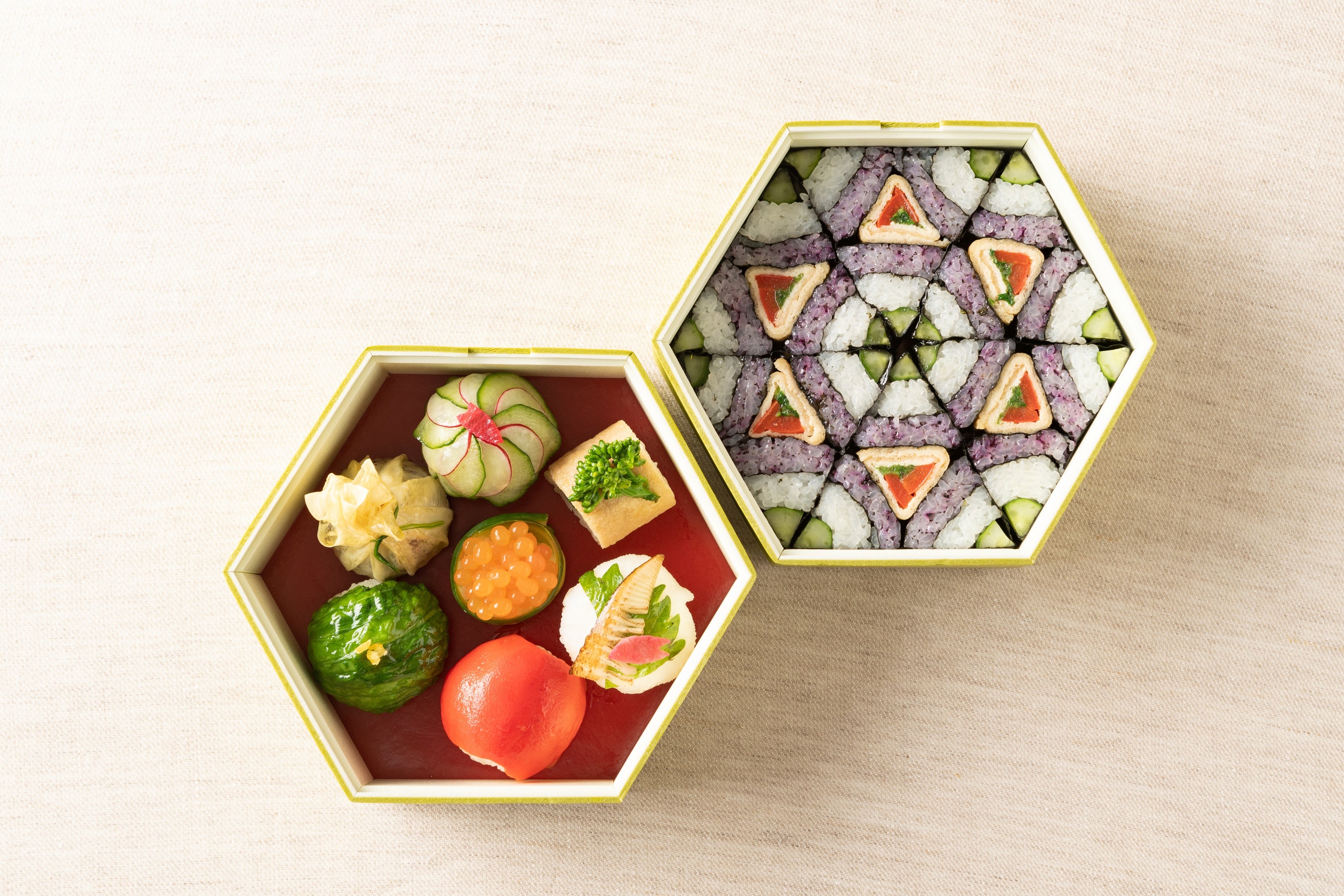 かねてより取り組んでいるフードロスの削減のもと、京都の野菜を余すことなく使い、 素材そのものの味を活かした見た目にもこだわった作品に仕上げました。 京都伝統のおばんざいの手法を活かした手毬寿司と万華鏡をイメージし色鮮やかに仕上げた飾り巻き寿司をお楽しみください。
