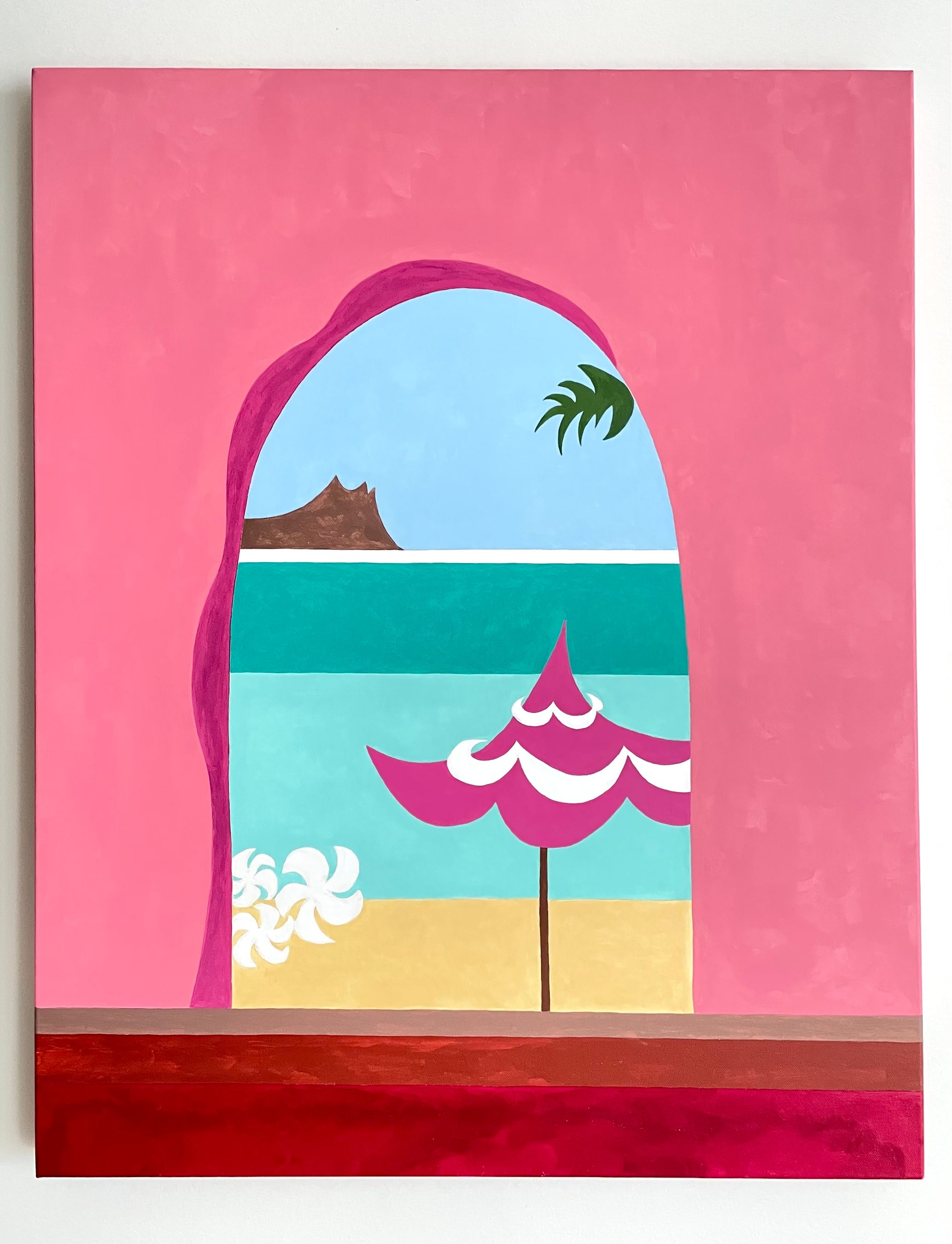 ロイヤルハワイアンホテルからワイキキの海が見える場所。言葉ではなかなか表現しにくいこの素敵な場所を描いた作品です。