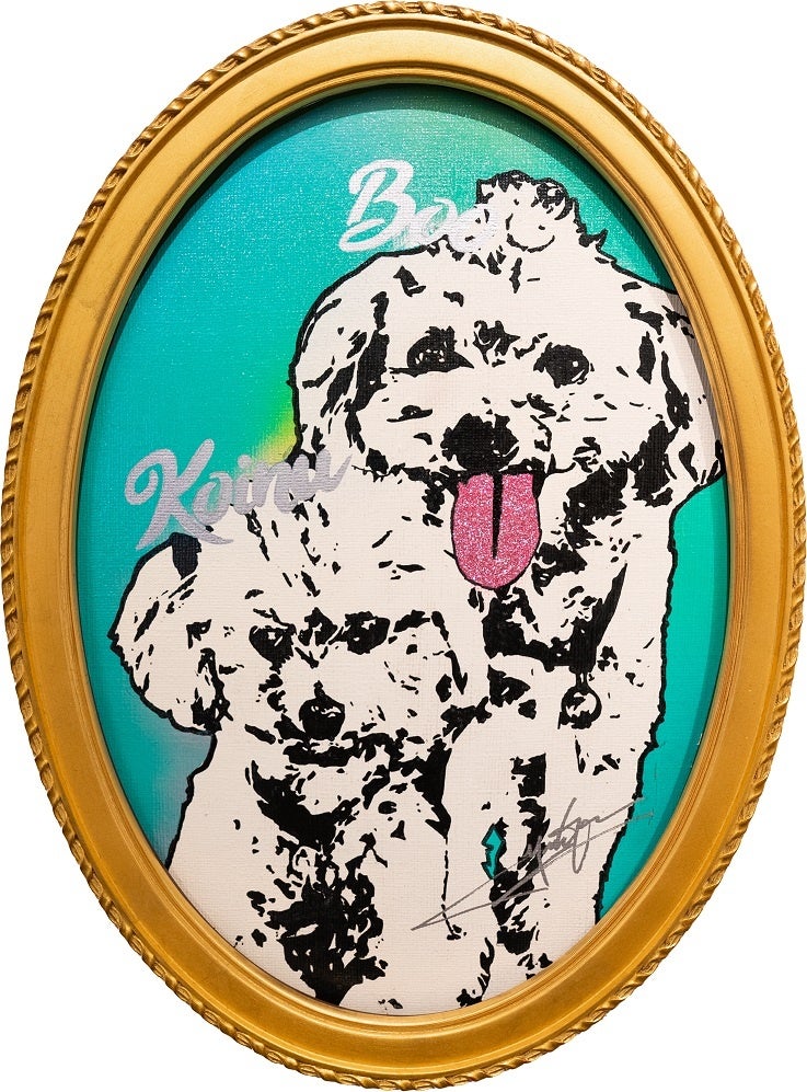 「Boo & Koinu」小野裕人(2022年/マーカーペン、カラースプレー、アクリル絵具、ラメ、キャンバス/41×29cm)