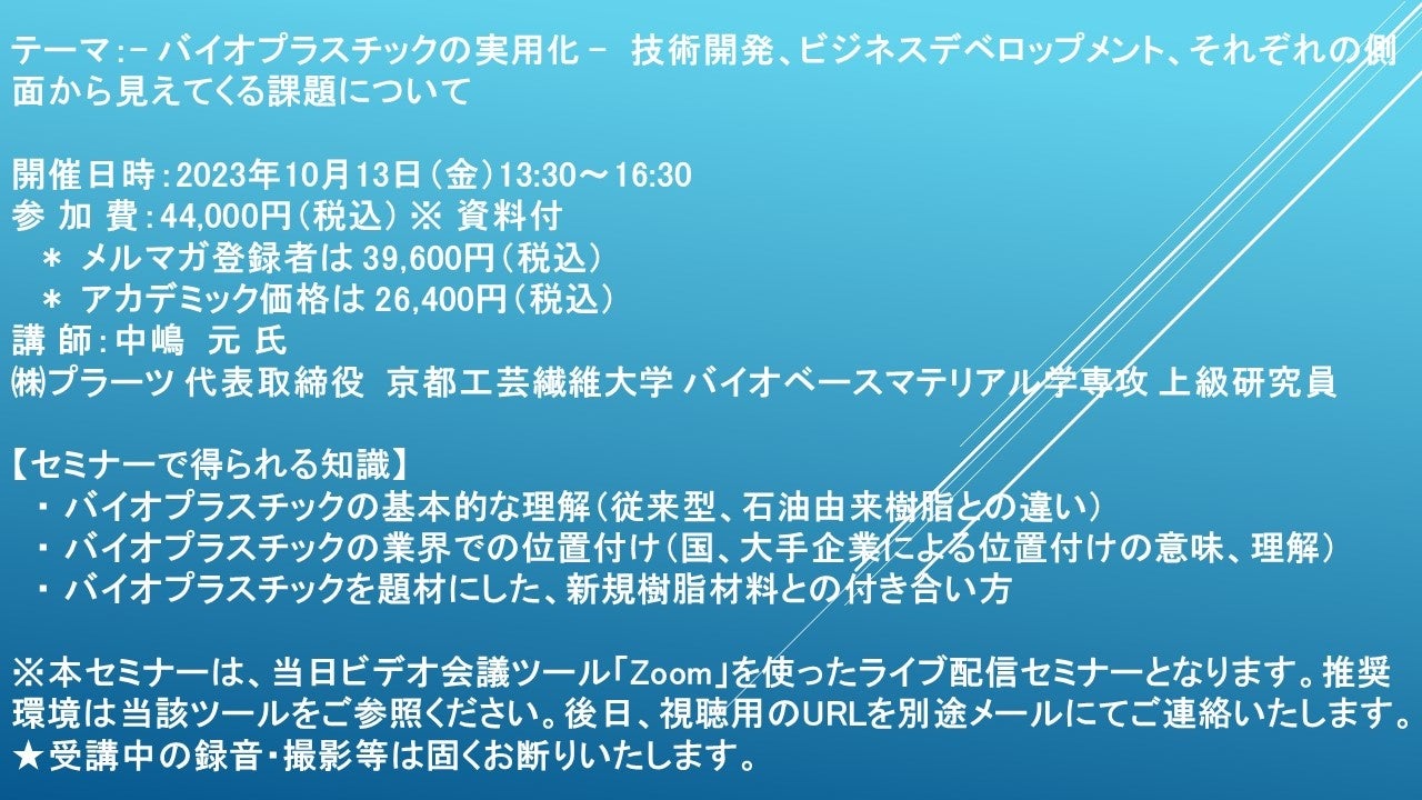 【ライブ配信セミナー】– バイオプラスチックの実用化 - 技術開発、ビジネスデベロップメント、それぞれの側面から見えてくる課題について 10月13日(金)開催 主催:(株)シーエムシー・リサーチ