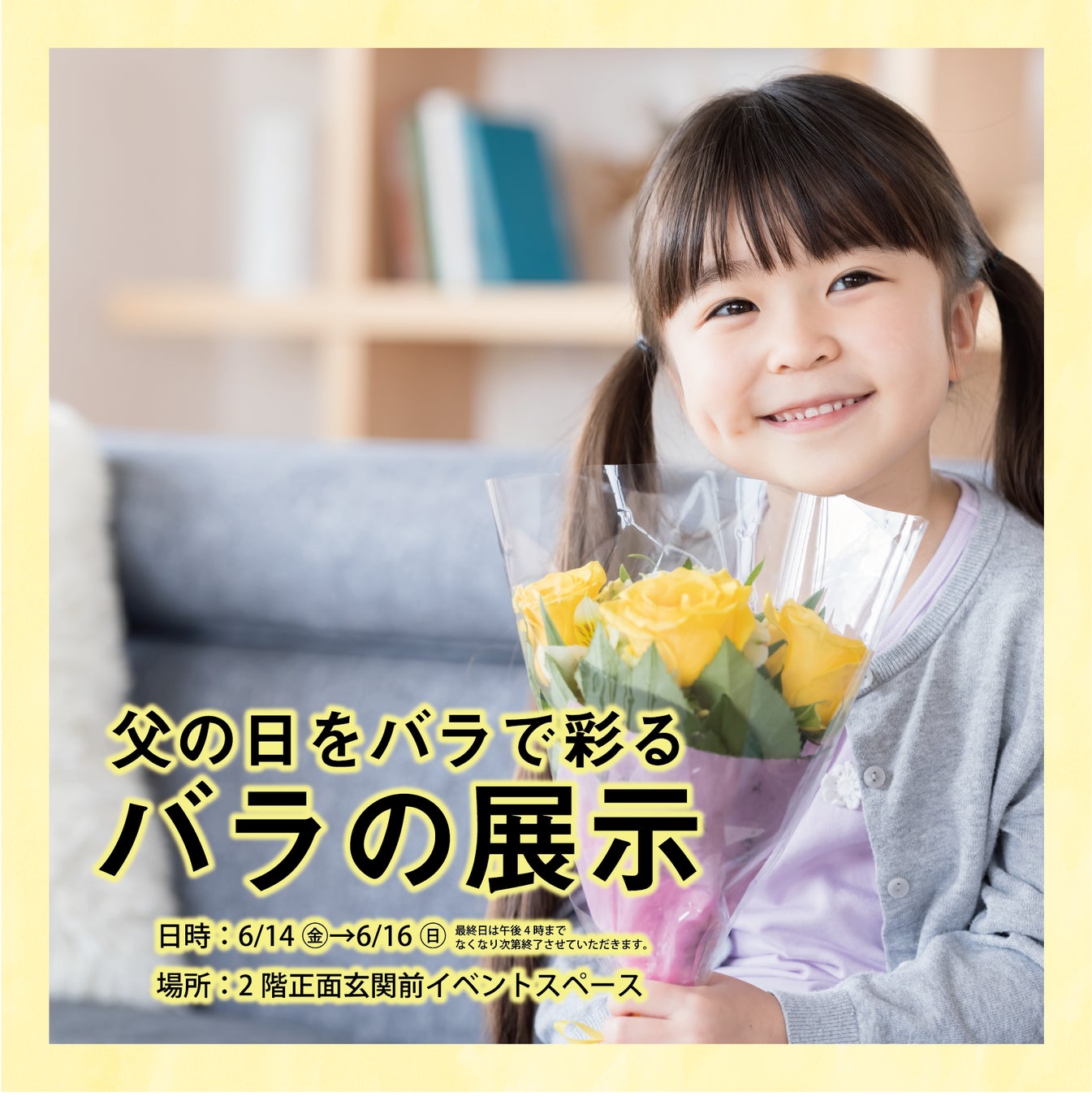 6月16日(日)父の日当日の10:00-13:00には、アンケート(大人)・似顔絵(お子さま)にご参加いただいた方の「父の日に花束が当たる抽選会」も開催、12:00から展示品のバラの花を販売いたします。