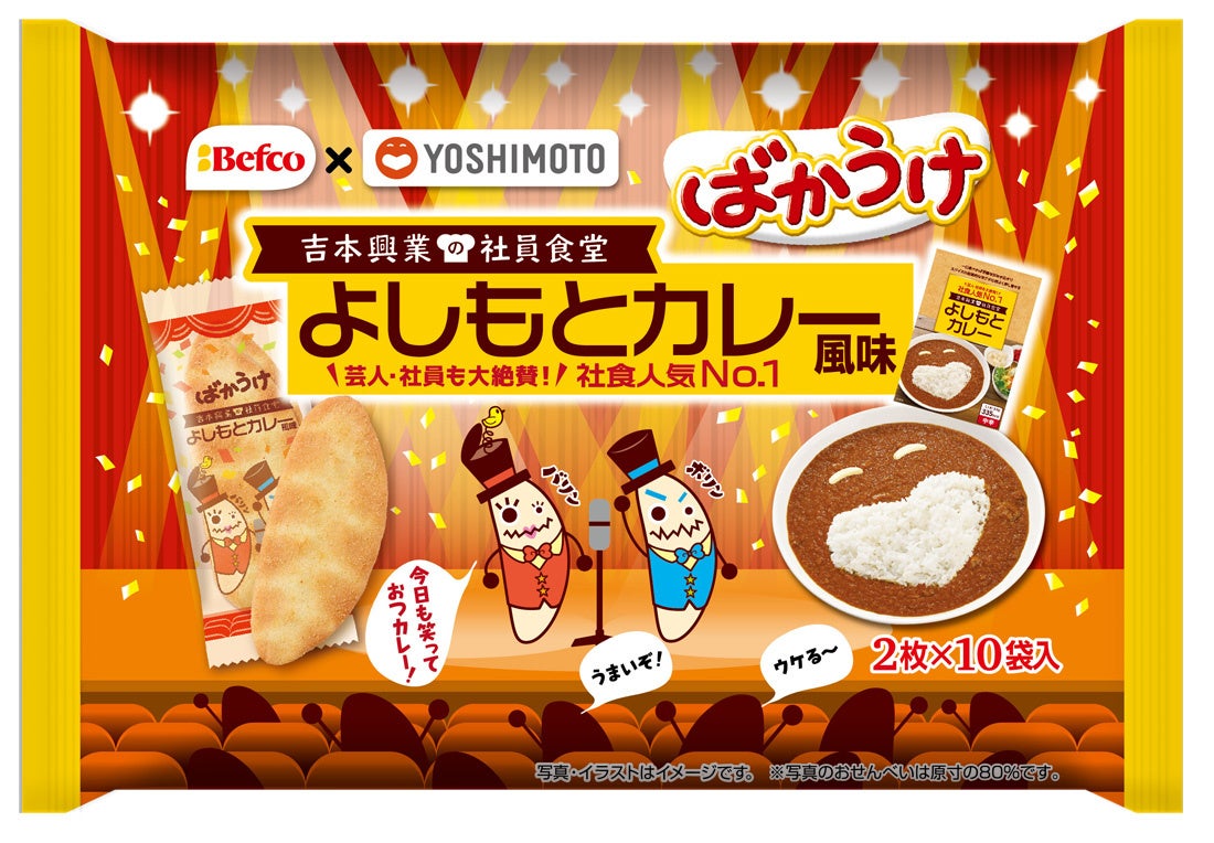 吉本興業東京本部にある社員食堂で最も人気の高いメニュー「よしもとカレー」と、新潟県の米菓メーカー、(株)栗山米菓のコラボレーション「ばかうけ よしもとカレー風味」が9月11日(月)に、全国のスーパーやドラッグストアなどで発売されます。