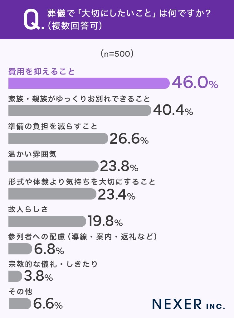 ■46.0%が、葬儀で大切にしたいことは「費用を抑えること」と回答