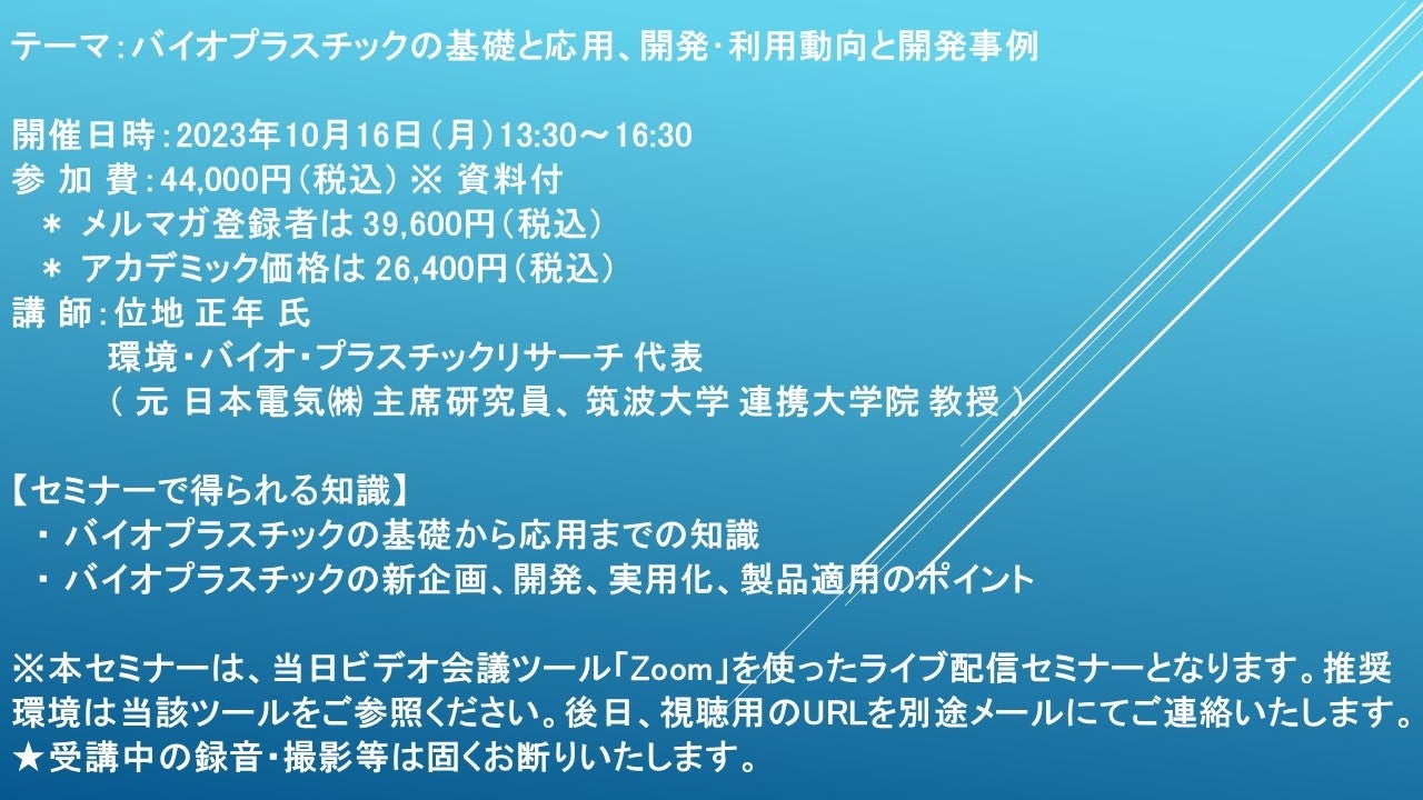 【ライブ配信セミナー】バイオプラスチックの基礎と応用、開発・利用動向と開発事例 10月16日(月)開催 主催:(株)シーエムシー・リサーチ