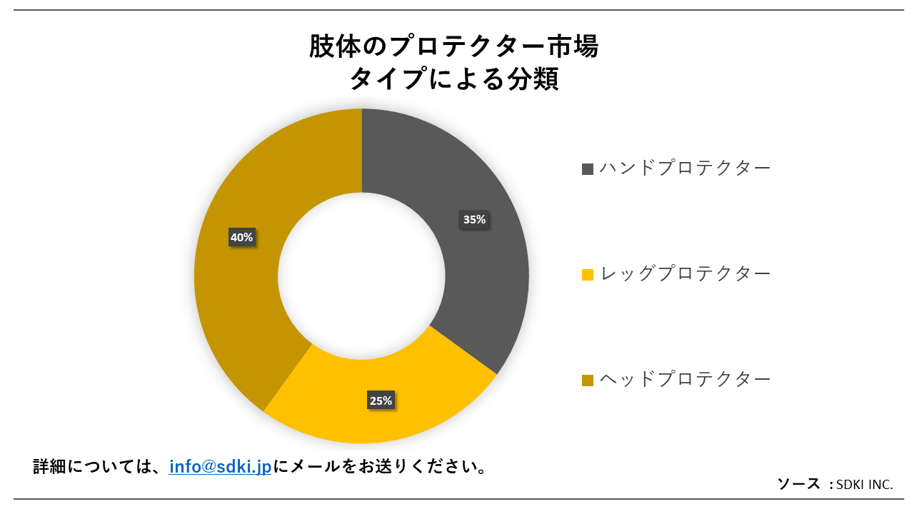 アジア太平洋地域は、2035年末までに最も高い収益を上げると予想されており、その背景には、この地域での事故多発があります。現在、交通事故による死亡者数はマラリアによる死亡者数を上回っており、2030年にはHIV/AIDSと結核による死亡者数をそれぞれ2倍、4倍、3倍に上回ると予測されています。インドでは、2021年の1年間に合計4,12,432件の交通事故が報告され、1,53,972人が死亡、3,84,448人が負傷しています。それゆえ、肢体のプロテクターの需要は拡大しています。また、日本ではスポーツの盛んな国であるため、日本での需要も高い。2021年10月に行われた調査では、10歳以上の日本人の成人の約65%がスポーツに参加していることが明らかになりました。