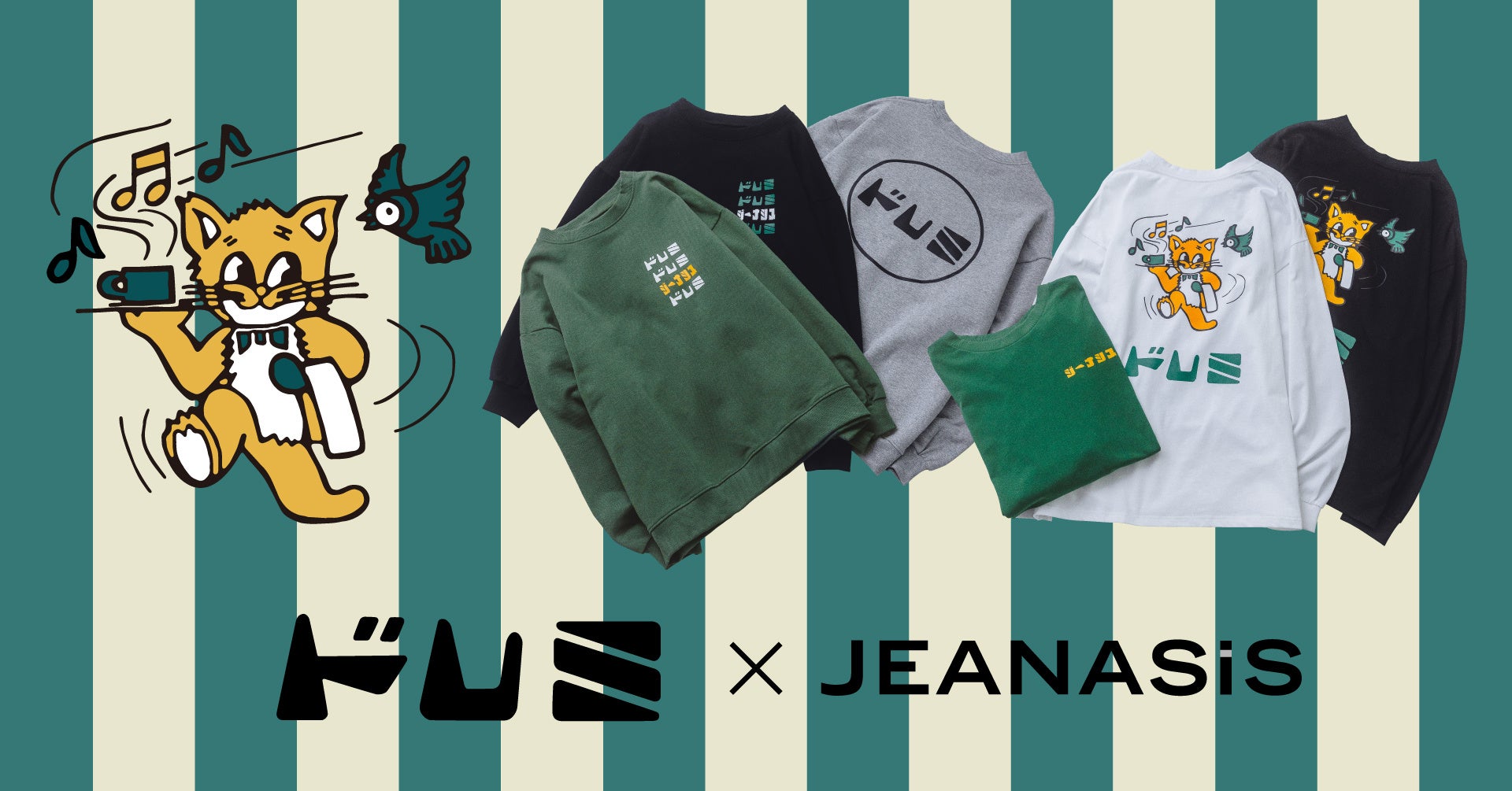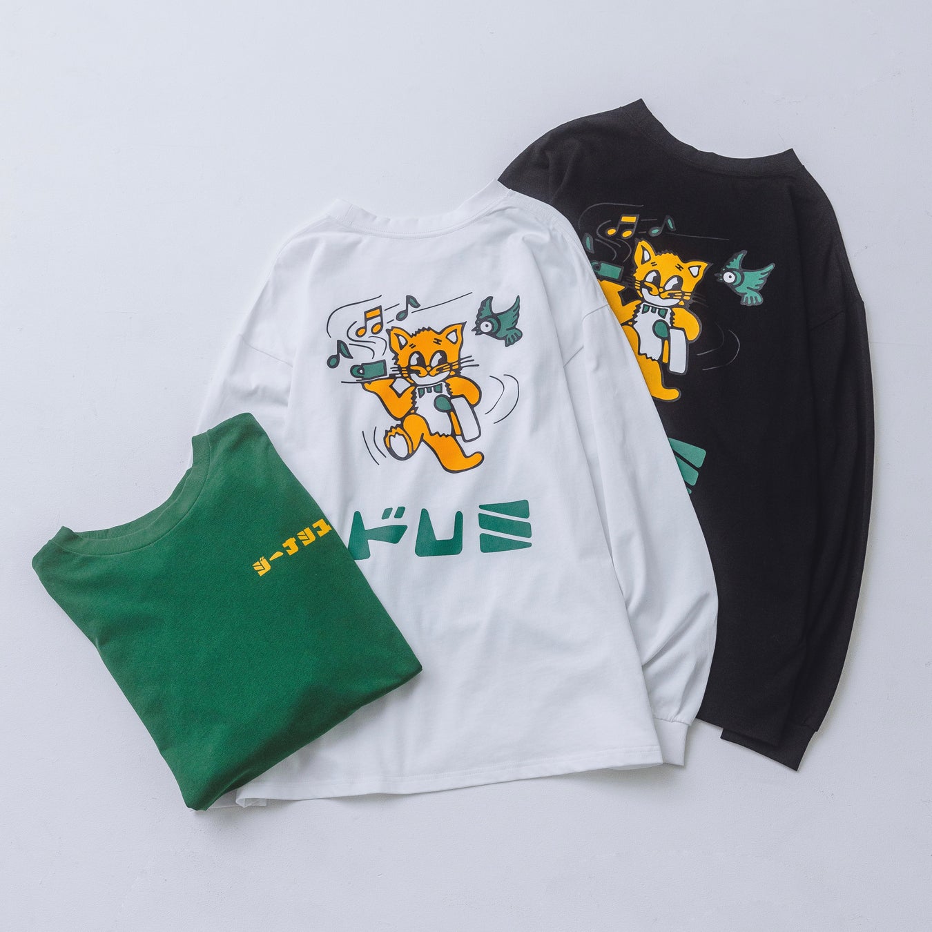 コラボアイテムは、ロンTとスウェットの2型をラインアップ。ロンTは「喫茶ドレミ」の愛らしいキャラクターの猫をそのままグラフィックに落とし込んだデザイン、スウェットは「喫茶ドレミ」のロゴを大胆にプリントしました。どちらも「喫茶ドレミ」のレトロな雰囲気とジーナシスのクールさを掛け合わせた限定デザインです。