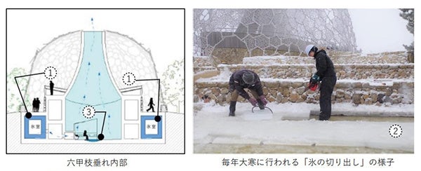 展望台内部の「1.氷室(ひむろ)」には冬に「2.氷棚(ひょうだな)」に張った天然の氷を切り出して貯蔵しています。夏に氷室を開いて風を取り込むと、氷室を通った冷たい風が展望台内部へ送られます。展望台の内部は天然のクーラーで冷やされ真夏でも20℃程度に保たれます。