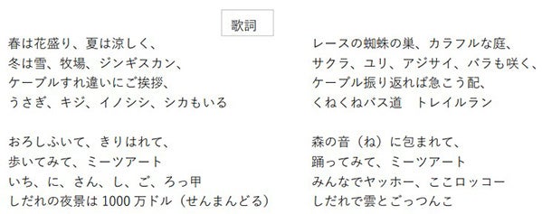 オクラホマミキサーをリミックスし、六甲ミーツ・アート芸術散歩ならではの歌詞を付けてテーマ曲を完成させました。2番の歌詞は六甲山で見た風景や自然環境に思いを馳せながらワークショップに参加した学生有志とともに作詞しました。